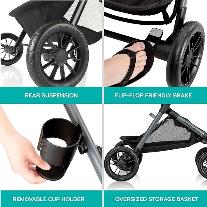 - ACCESSORIZE IT: Stroller is compatible with the Evenflo Stroller Child Snack Tray with Snack Cup, Stroller Rider Board and Infant Car Seat Adapter, and the Pivot Xpand Stroller Market Basket (all sold separately)