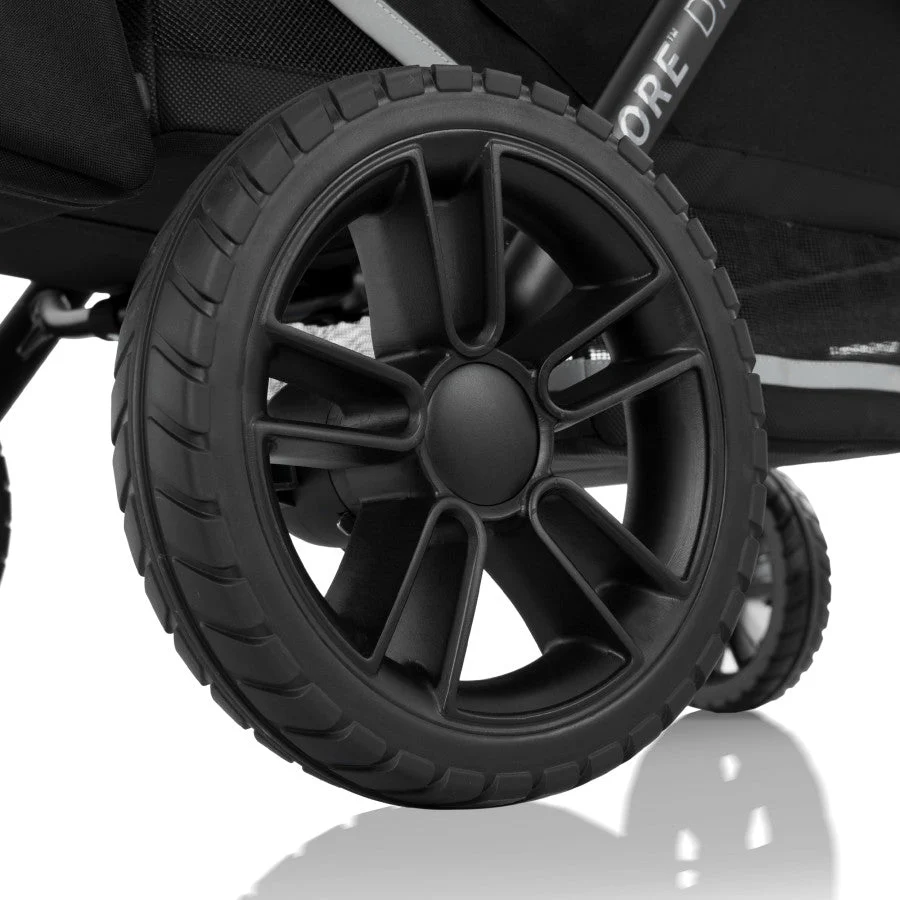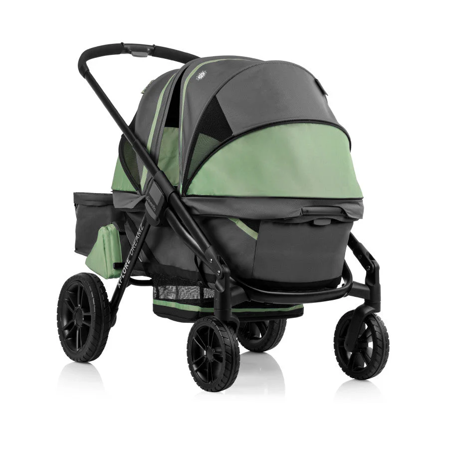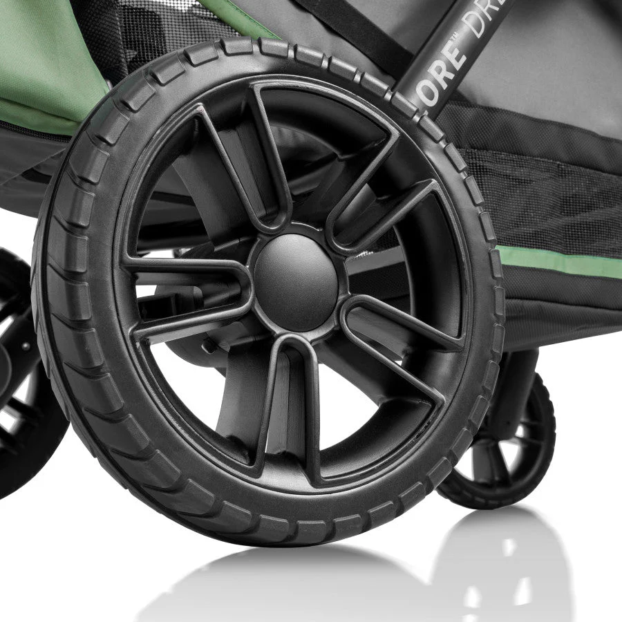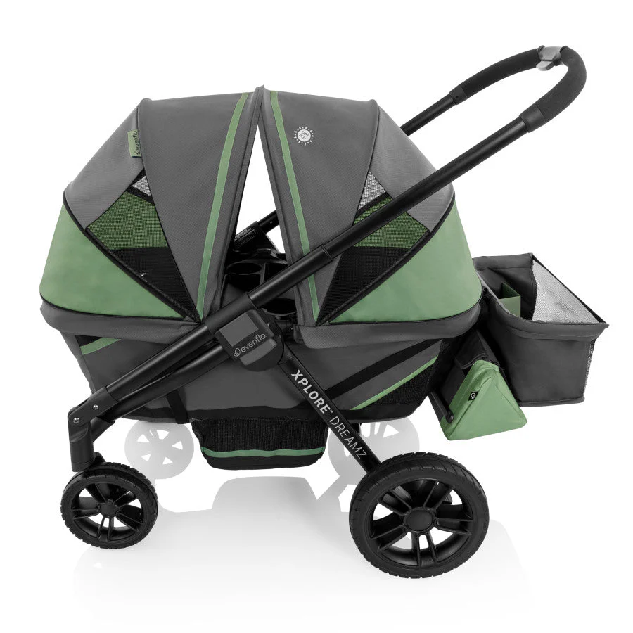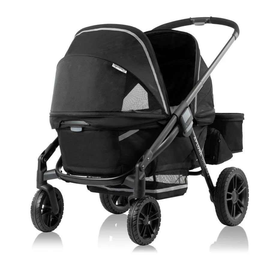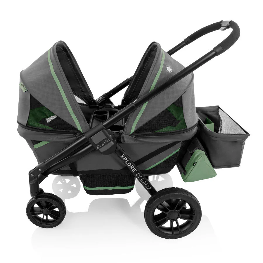 Adventuring can take a lot out of a little one! Be ready for naptime on the go with the Pivot Xplore™ Dreamz All-Terrain Stroller Wagon with Bassinet Insert. Designed for children from 6 months to 33 lb, the bassinet insert lets your little one take a break from the action comfortably, then tucks out of the way until the next catnap. This all-terrain ride accommodates up to two children ages 6 months to 5 years, with each seat holding a child up to 55 lb (110 lb total). As with our bestselling Pivot Xplore, the Xplore Dreamz transforms with a flip of the three-position, telescoping handle, allowing you to push as a stroller or pull as a wagon even as your child nods off in the bassinet insert. Larger UPF 50+ canopies expand from 2 to 3 panels with a quick unzip to help protect your child against the sun’s harmful rays, while breathable mesh helps to keep naptime comfortable. A newly extended footwell gives energetic little legs extra room. With 3-point harness secured, the rugged, all-terrain wheels take your family adventure from pavement to beach and beyond, while the wagon’s 27 in. width fits through most doorways with ease. For more flexible seating, the Xplore Dreamz accepts a toddler seat or infant car seat adapter (both sold separately). To keep little gigglers busy, the included BPA-free child tray features two cup holders. Mesh pockets store snacks, toys and items you want to keep within reach. An additional, detachable storage basket includes pop-out cup holders for adults. Elastic straps on the side of the wagon hold everything from umbrellas to water bottles to keys. The front of the wagon drops down with the press of a button for easy in and out. Quick, easy, compact fold makes your Xplore Dreamz a breeze to pack up for travel. From adventure to naps, you’re ready for a full day of fun.