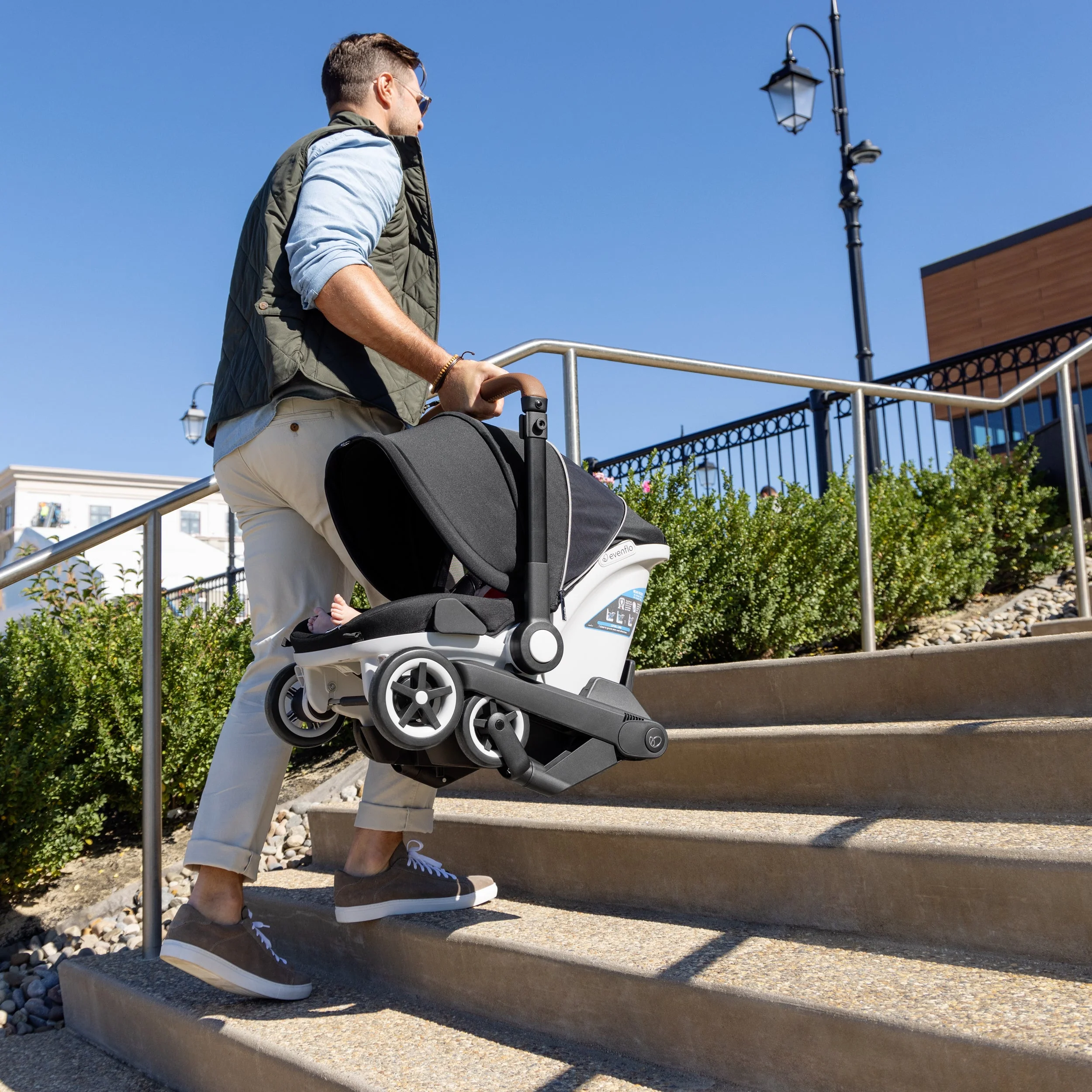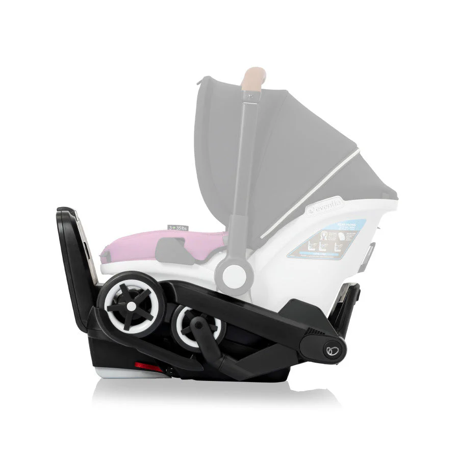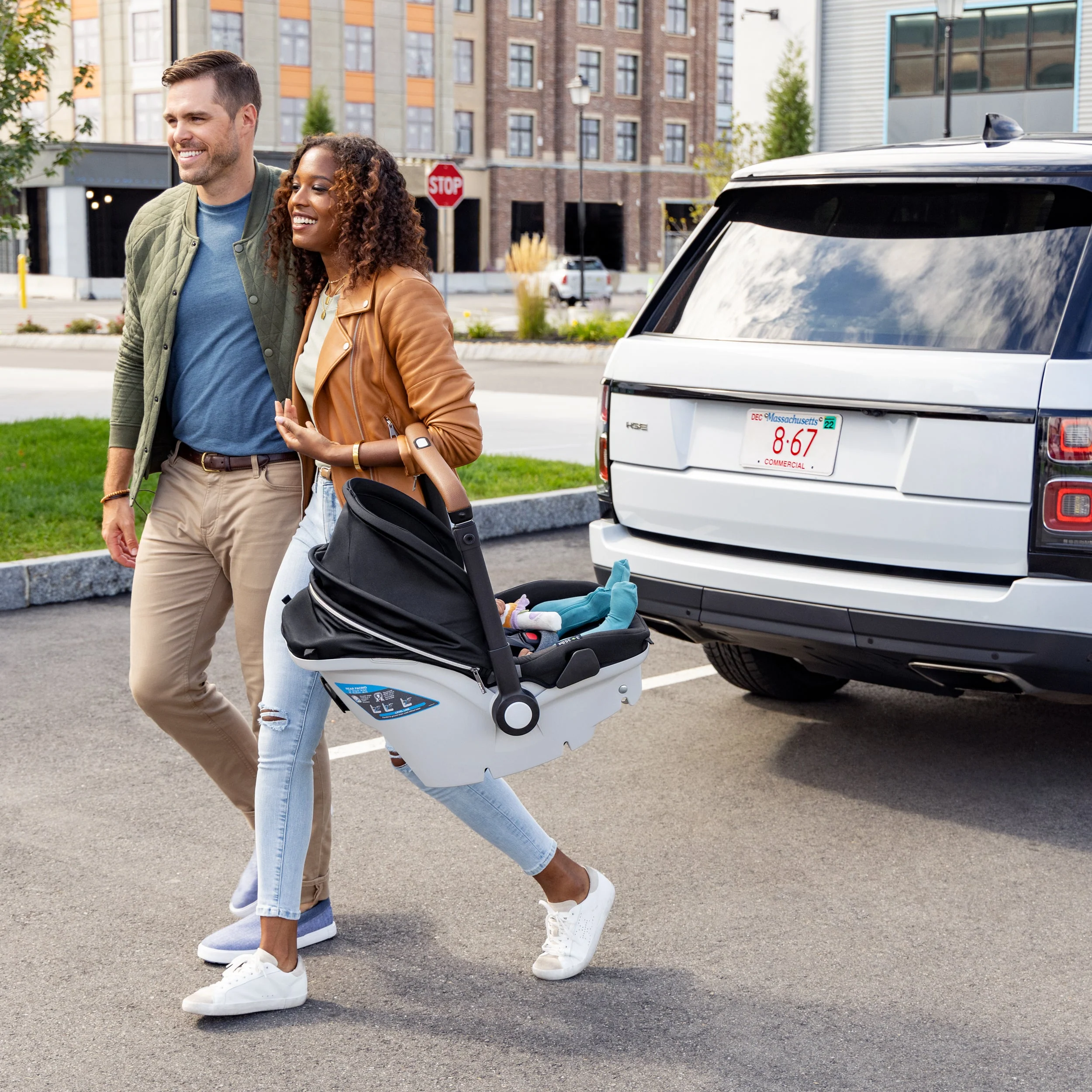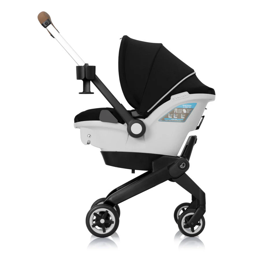 Shyft into life with a newborn! The Evenflo® Shyft™ DualRide™ with Carryall Storage Infant Car Seat and Stroller Combo is a single piece of baby gear that Shyfts from infant car seat to stroller in one step, streamlining life on the go. Moving from car to sidewalk? Simply lift the carrier off the base, release the wheels and you’re rolling in no time. From backseat to street in a heartbeat! Maneuvering stairs? Retract the wheels, carry up/down steps, pop the wheels back down and stroll on. No struggling with multiple pieces of gear. No disturbing your little one. This car seat stroller combo makes every trip easier. While researching the best car seats for your little one, consider this: DualRide’s anti-rebound base absorbs and dissipates crash forces to provide additional stability and give you peace of mind, so you can make the Shyft with confidence. Designed for infants as small as 3 lb and up to 35 lb, who measure from 15.7 in. to 32 in., this infant car seat and stroller in one comes with a no-rethread harness that adjusts to 8 positions to grow with your child. Thoughtful design places the infant carrier on the stroller higher, so your baby’s sweet face is always near. You’re looking for a safe infant car seat — and the smart car seat is a connected car seat. With SensorSafe™ to connect you to your little one from the backseat, the DualRide is the savvy choice when it comes to child car seat safety. In car seat mode, DualRide’s integrated SensorSafe technology alerts you in real-time to 4 potentially unsafe conditions from your child’s car seat via Bluetooth: unexpected chest clip unbuckling, temperature too hot or too cold in the car, child unattended in the car, and child seated too long. LockStrong™ Installation and Quick Connectors provide solid, secure installation in no time. This stroller car seat combo provides a full-coverage canopy to block rain and snow, with UPF 50+ to protect your baby against the sun. With the DualRide stroller and car seat combo, the extras aren’t extra! A removable carryall storage bag and removable parent cupholder are included. Another plus: Wheels nest securely in the base wheel wells in your vehicle, so you can take just the carrier into your home without tracking in dirt. To finish it off, DualRide’s sophisticated silhouette, washable padding and well-considered touches ensure you’ll make the Shyft to new parenthood in style. Shyft into action, effortlessly!