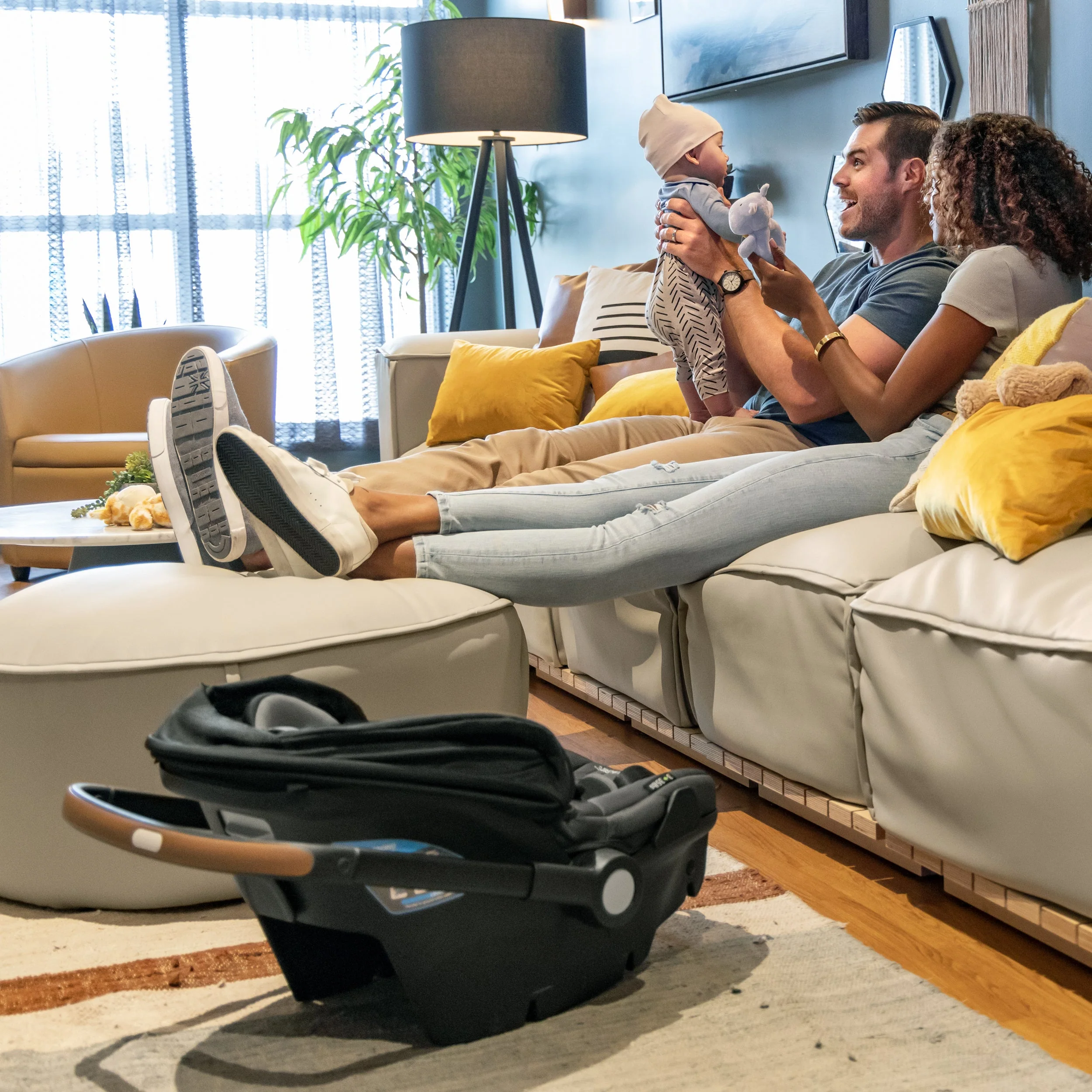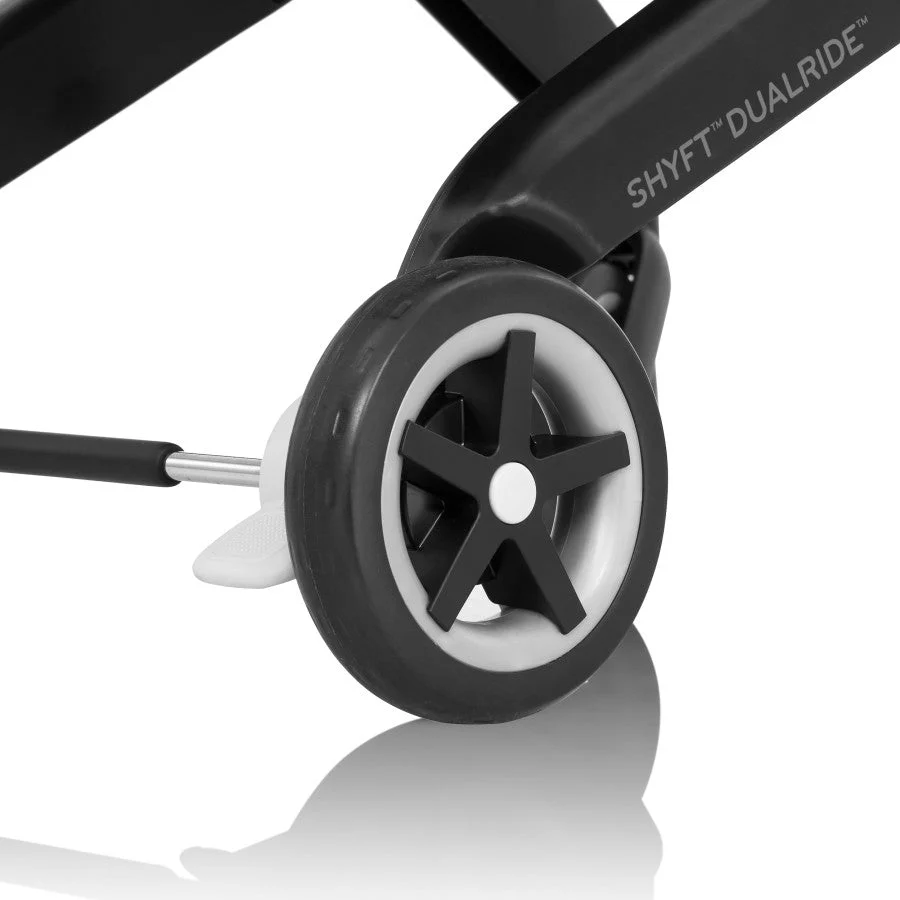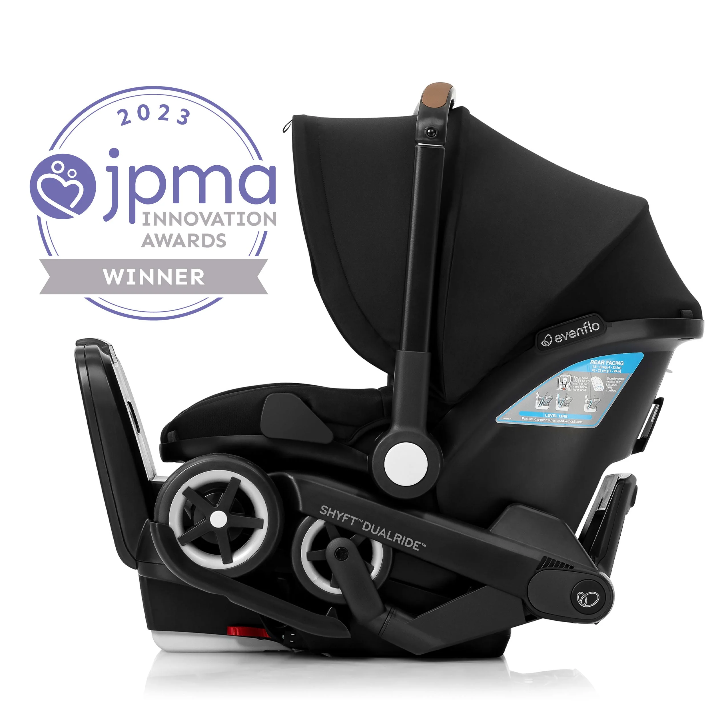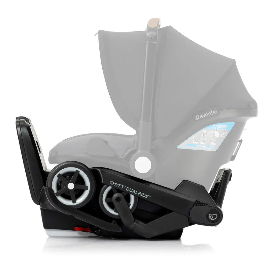 Shyft into life with a newborn! The Evenflo® Shyft™ DualRide™ with Carryall Storage Infant Car Seat and Stroller Combo is a single piece of baby gear that Shyfts from infant car seat to stroller in one step, streamlining life on the go. Moving from car to sidewalk? Simply lift the carrier off the base, release the wheels and you’re rolling in no time. From backseat to street in a heartbeat! Maneuvering stairs? Retract the wheels, carry up/down steps, pop the wheels back down and stroll on. No struggling with multiple pieces of gear. No disturbing your little one. This car seat stroller combo makes every trip easier. While researching the best car seats for your little one, consider this: DualRide’s anti-rebound base absorbs and dissipates crash forces to provide additional stability and give you peace of mind, so you can make the Shyft with confidence. Designed for infants as small as 3 lb and up to 35 lb, who measure from 15.7 in. to 32 in., this infant car seat and stroller in one comes with a no-rethread harness that adjusts to 8 positions to grow with your child. Thoughtful design places the infant carrier on the stroller higher, so your baby’s sweet face is always near. You’re looking for a safe infant car seat — and the smart car seat is a connected car seat. With SensorSafe™ to connect you to your little one from the backseat, the DualRide is the savvy choice when it comes to child car seat safety. In car seat mode, DualRide’s integrated SensorSafe technology alerts you in real-time to 4 potentially unsafe conditions from your child’s car seat via Bluetooth: unexpected chest clip unbuckling, temperature too hot or too cold in the car, child unattended in the car, and child seated too long. LockStrong™ Installation and Quick Connectors provide solid, secure installation in no time. This stroller car seat combo provides a full-coverage canopy to block rain and snow, with UPF 50+ to protect your baby against the sun. With the DualRide stroller and car seat combo, the extras aren’t extra! A removable carryall storage bag and removable parent cupholder are included. Another plus: Wheels nest securely in the base wheel wells in your vehicle, so you can take just the carrier into your home without tracking in dirt. To finish it off, DualRide’s sophisticated silhouette, washable padding and well-considered touches ensure you’ll make the Shyft to new parenthood in style. Shyft into action, effortlessly!