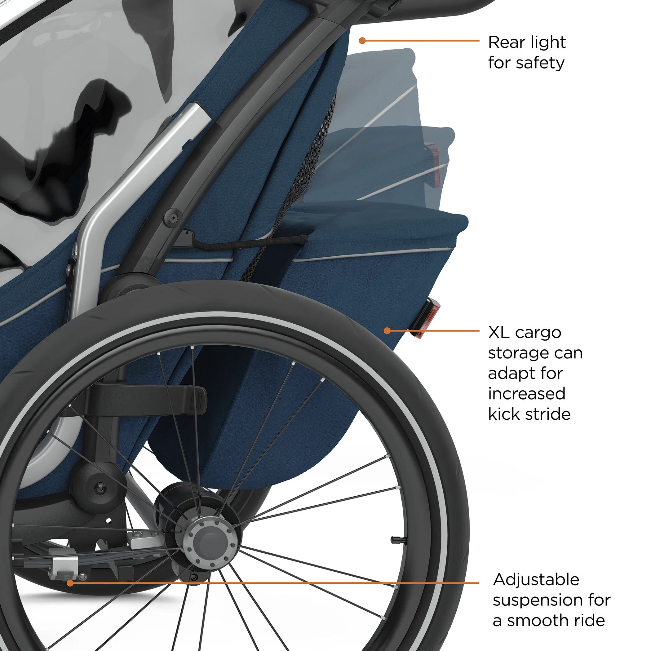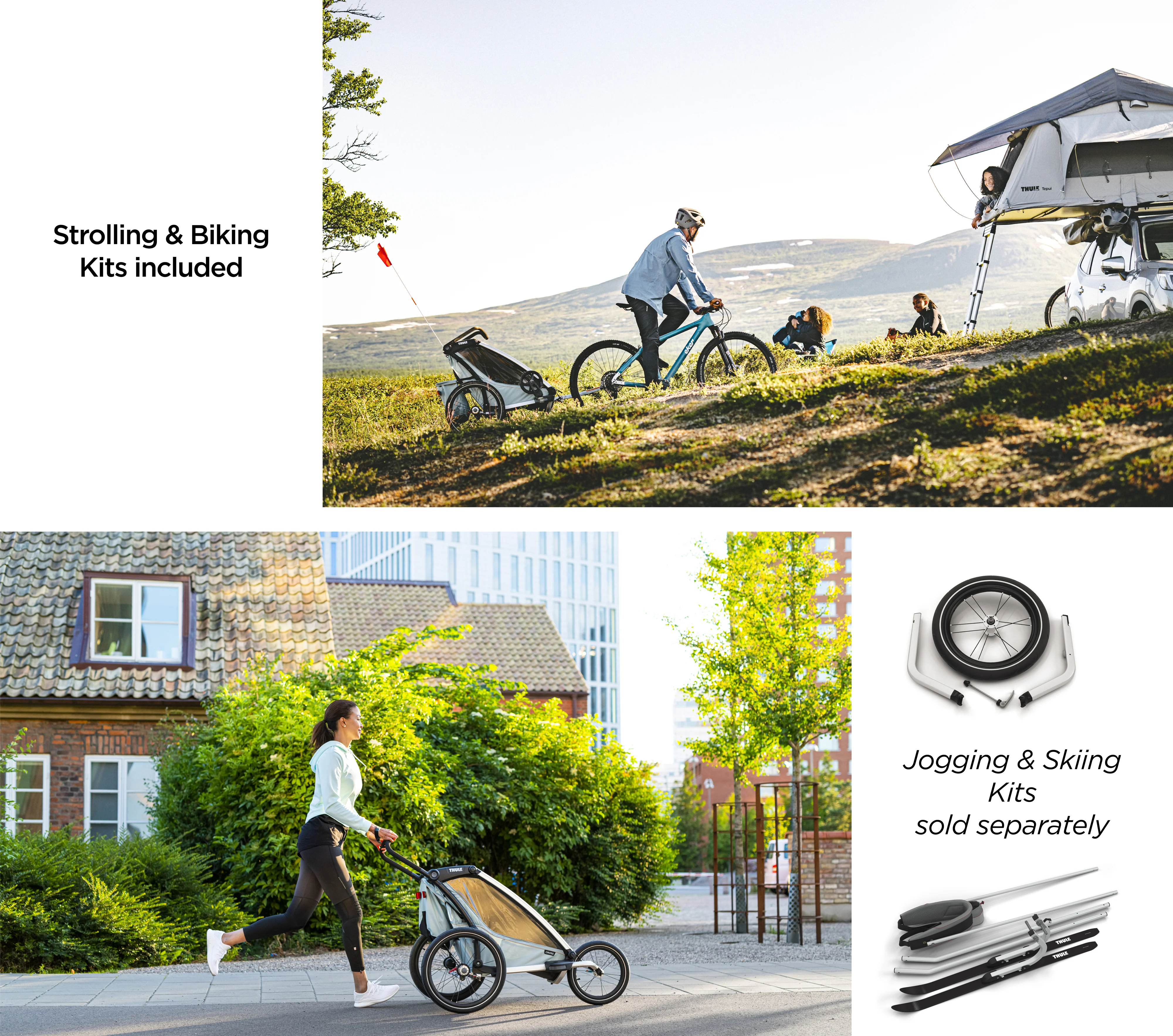 - Designed for use in 4 activities – bike trailer, jogging (kit sold separately), strolling, and skiing (kit sold separately)