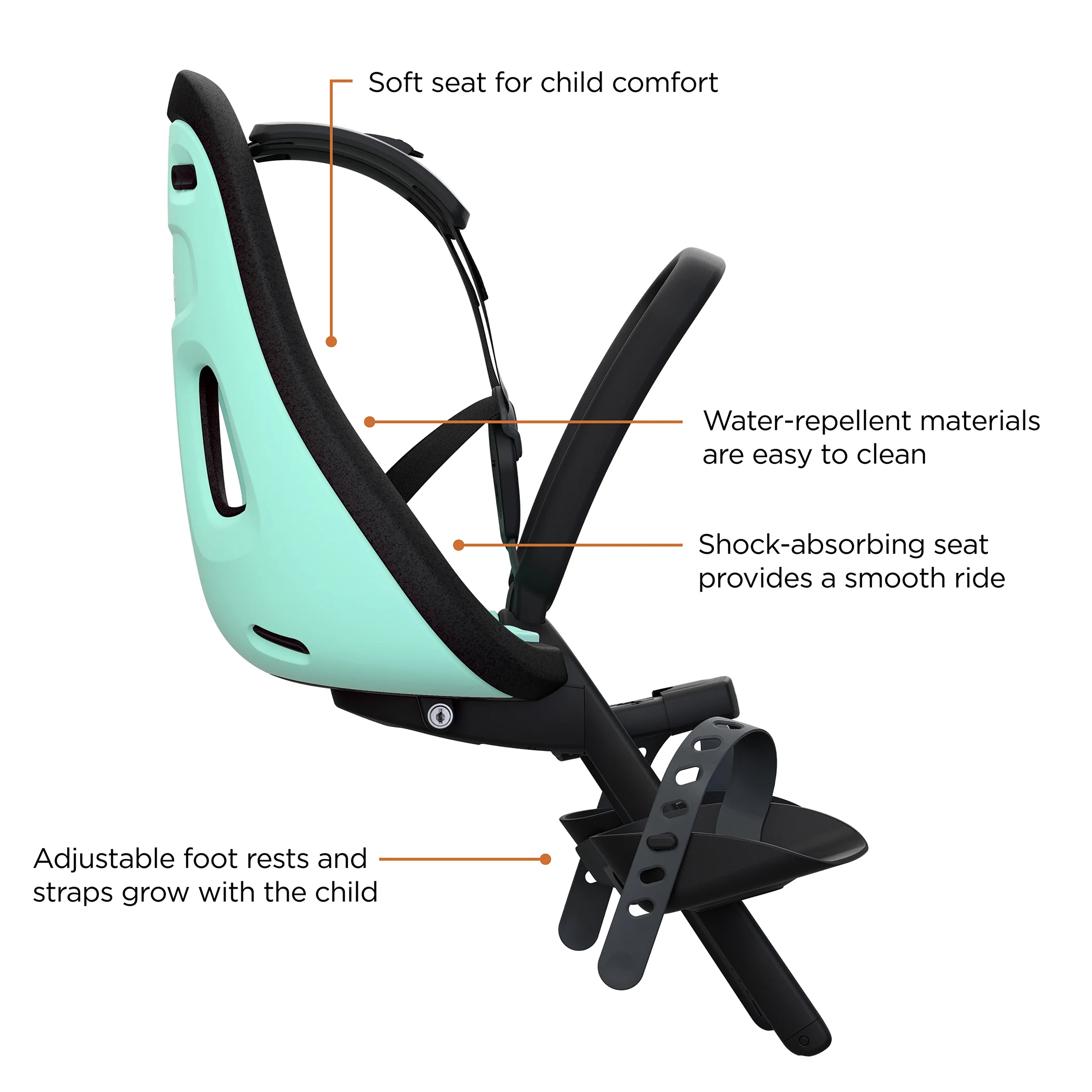 • Provides a smooth ride for your child in the soft and shock-absorbing seat