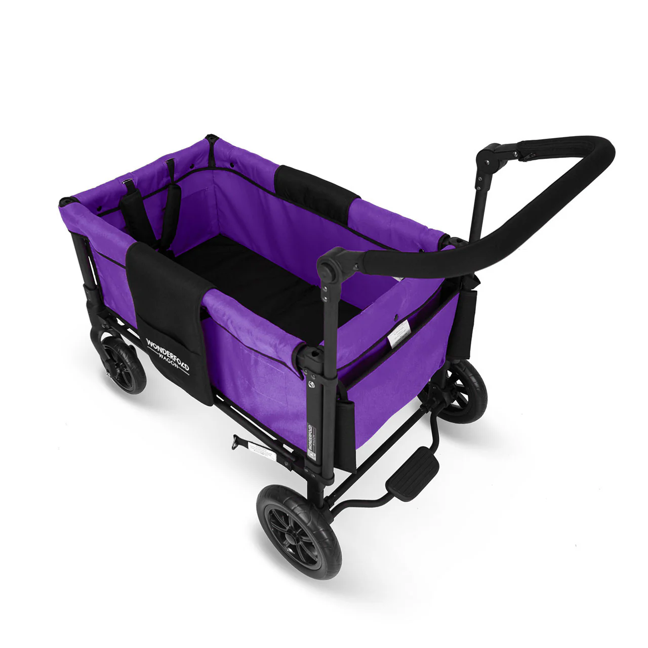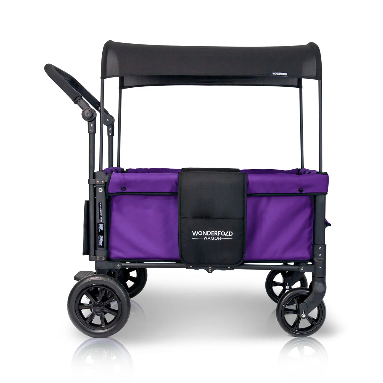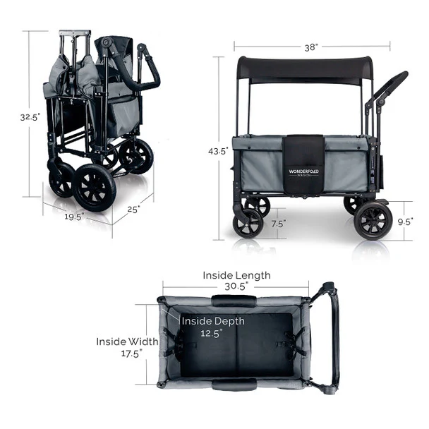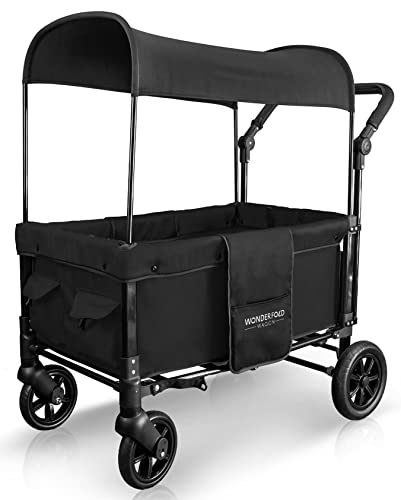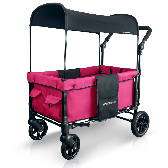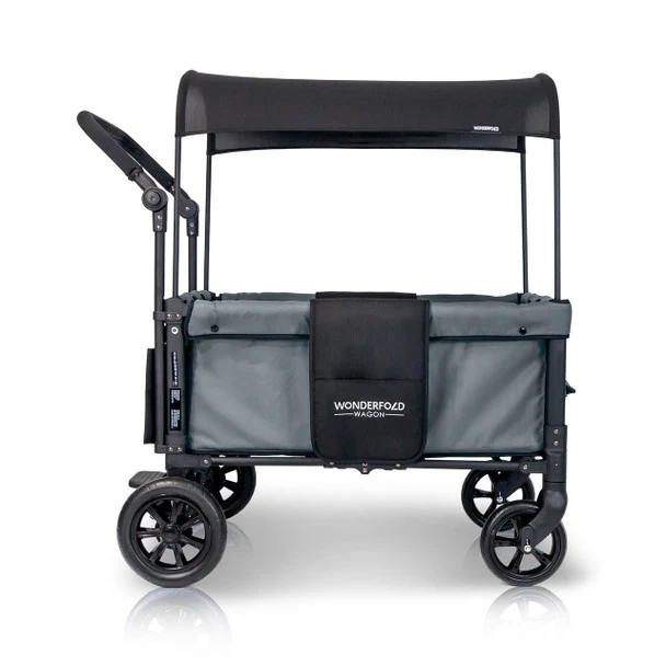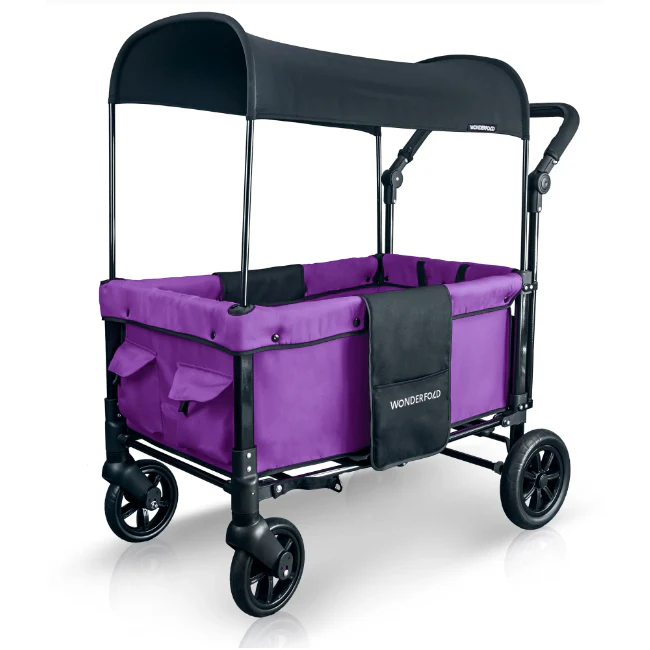 The convenient WonderFold Wagon W1 Double Stroller Wagon has facing seats with built-in seat belts, adjustable handlebar for easy maneuverability, plus a sliding canopy for varied coverage. Folds for storage and can double as a utility wagon.