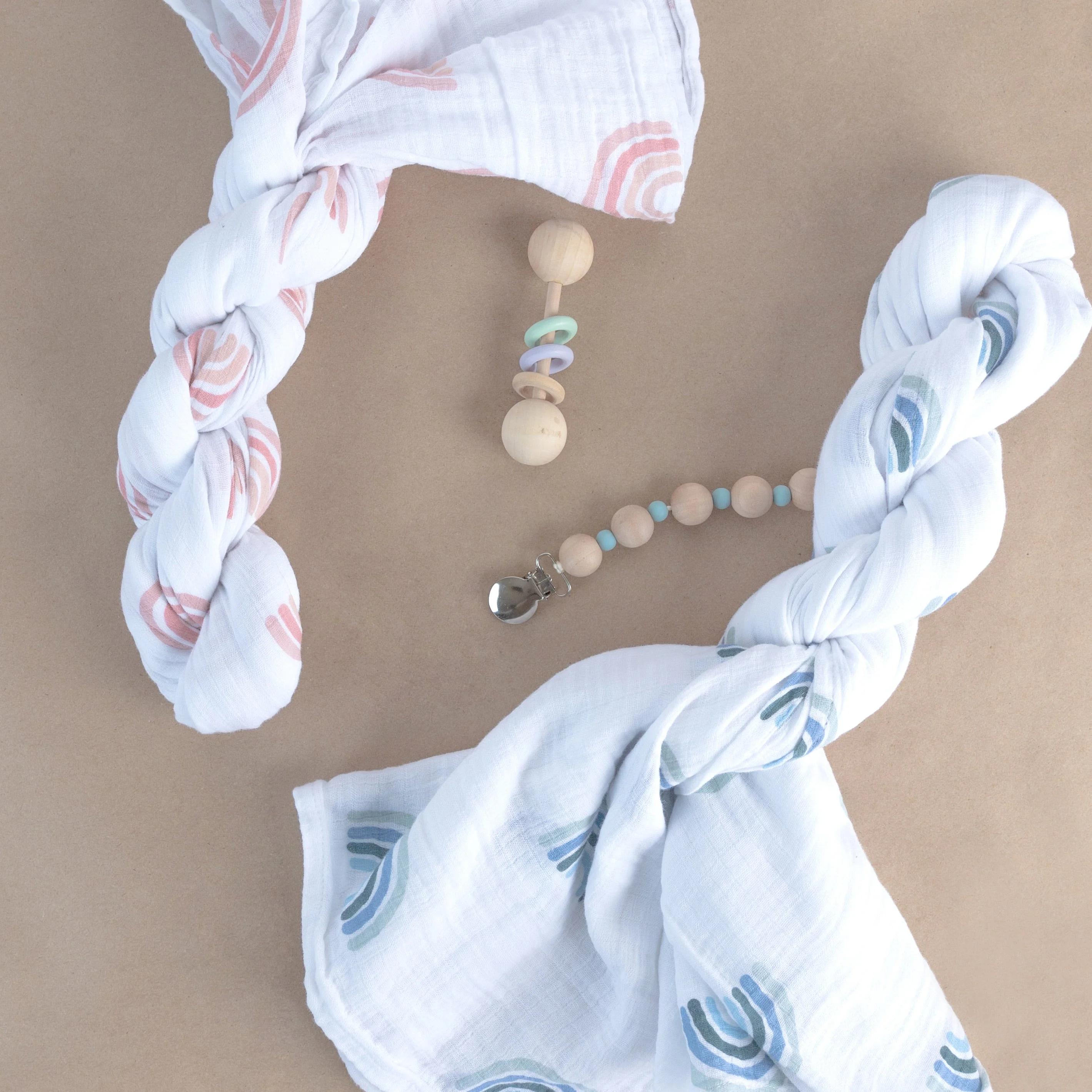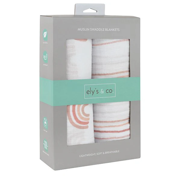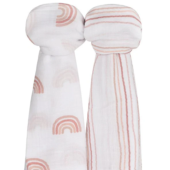- This set features two fashionable and charming, feminine styles — an on-trend, modern rainbow print and a contemporary yet classic stripe design, both in a beautiful mauve pink color pallete. These two stylishly designed swaddle blankets bundled in our gift-ready packaging make this set a perfect baby shower present for the baby girl in your life.