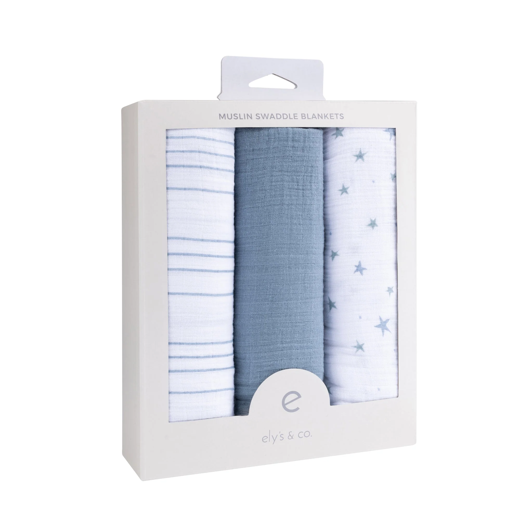 Ely’s & Co. Muslin Swaddle Blanket 3-Pack for Baby Boy— 100% Cotton Muslin Extra-Large Swaddle Blankets (47”x 47”) — Misty Blue, Stars│Solid│Stripes