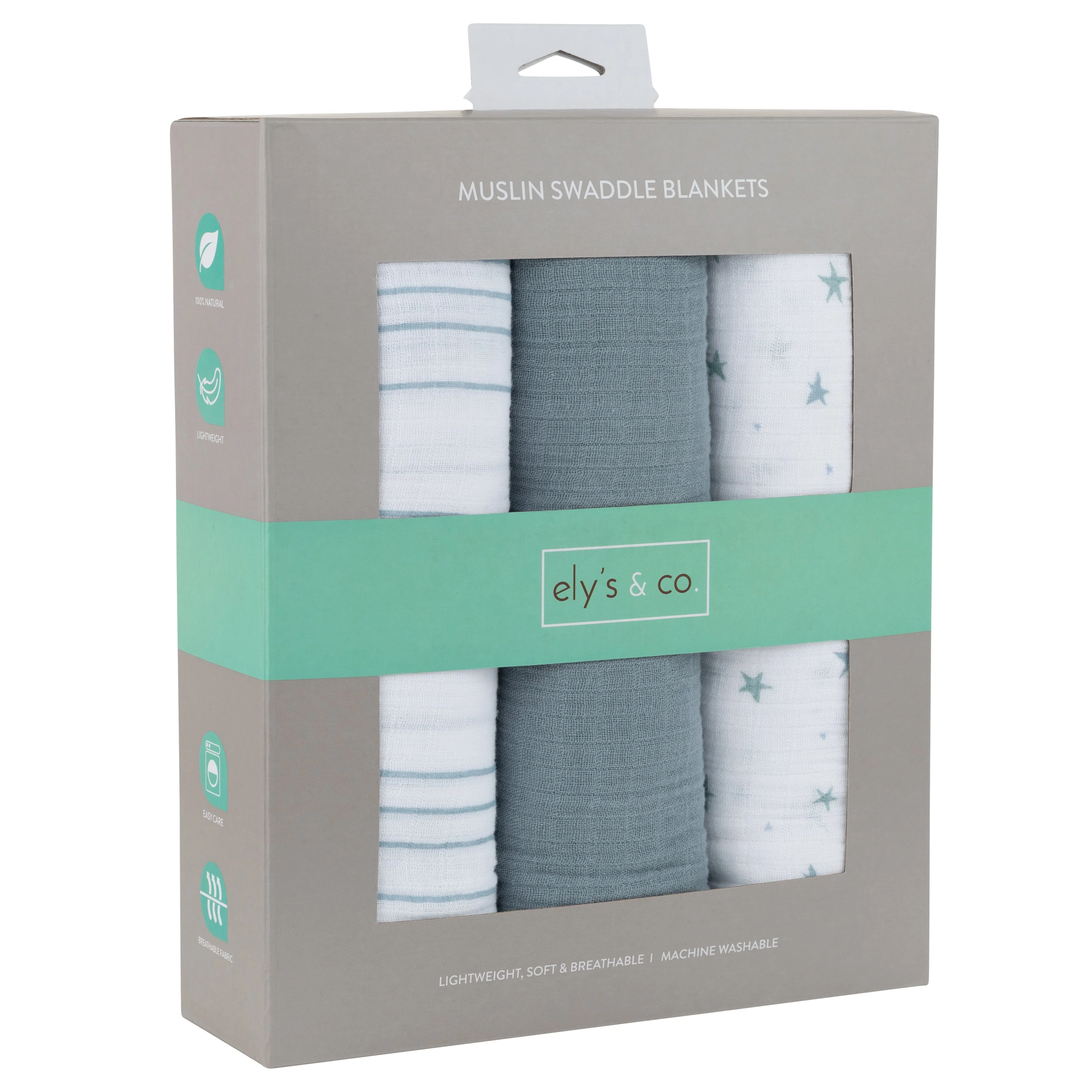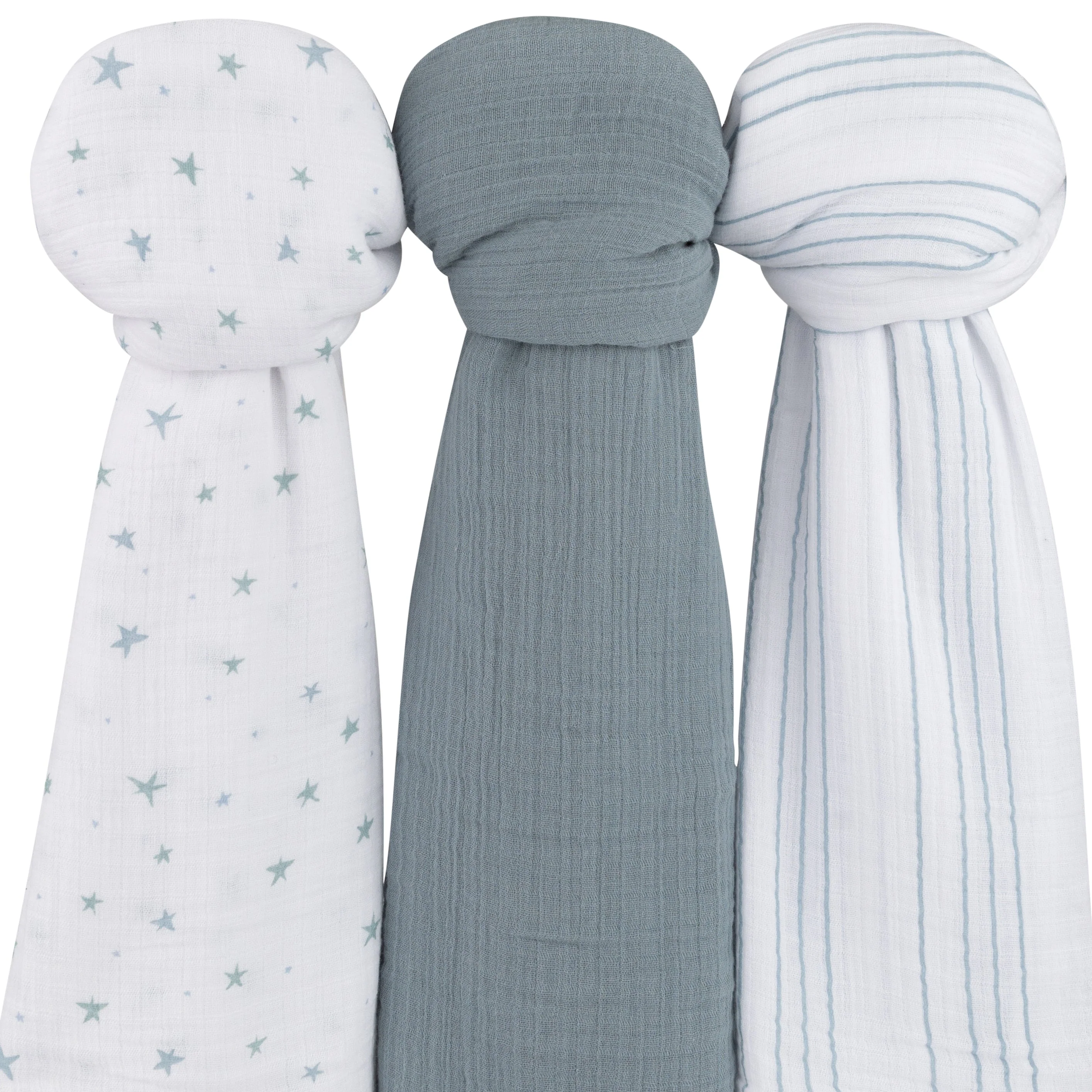 This trio features three modern and charming styles — classic stripes, shimmering stars, and a timeless solid, all in a chic and soothing misty blue. These three stylishly designed swaddle blankets bundled in our gift-ready packaging make this set a perfect baby shower present for the baby boy in your life.
