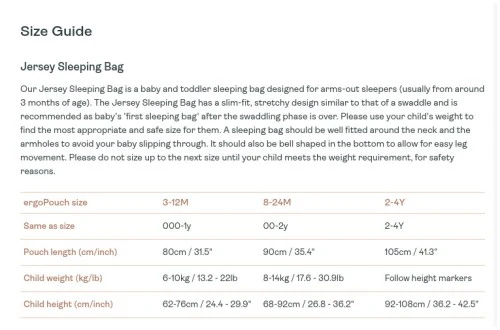 Warnings Ensure you buy the correct size for your baby's weight, to prevent the Bag from riding up around your baby's face. See our Size Guide for more information. For sleep only. Do not allow a child to walk around when wearing the Jersey Bag. Not suitable for use in a 5 point harness.