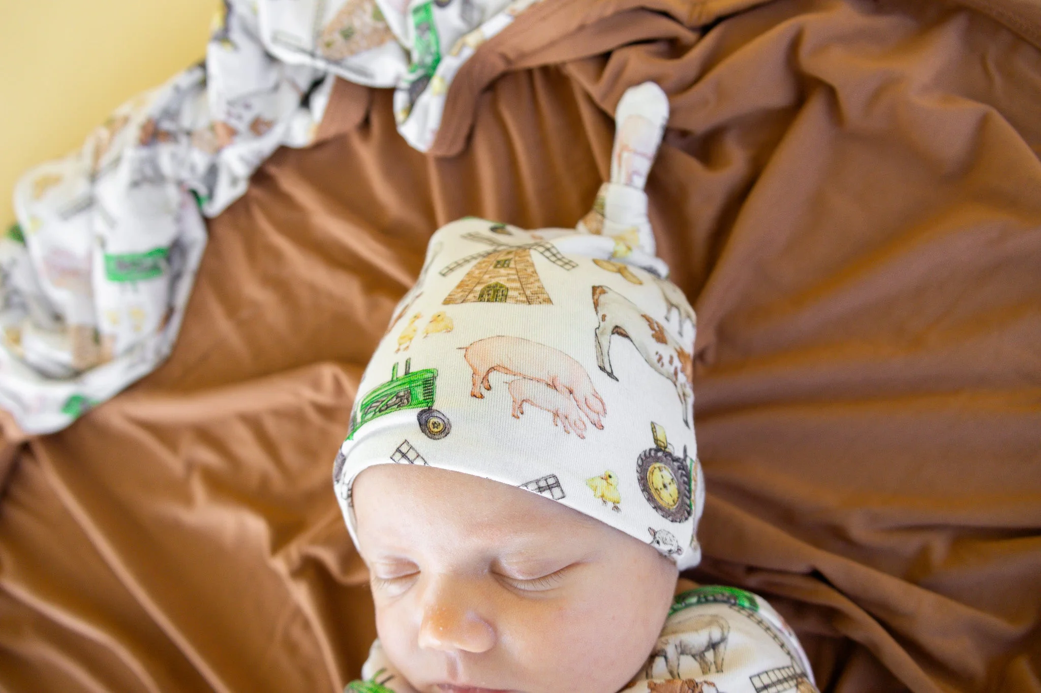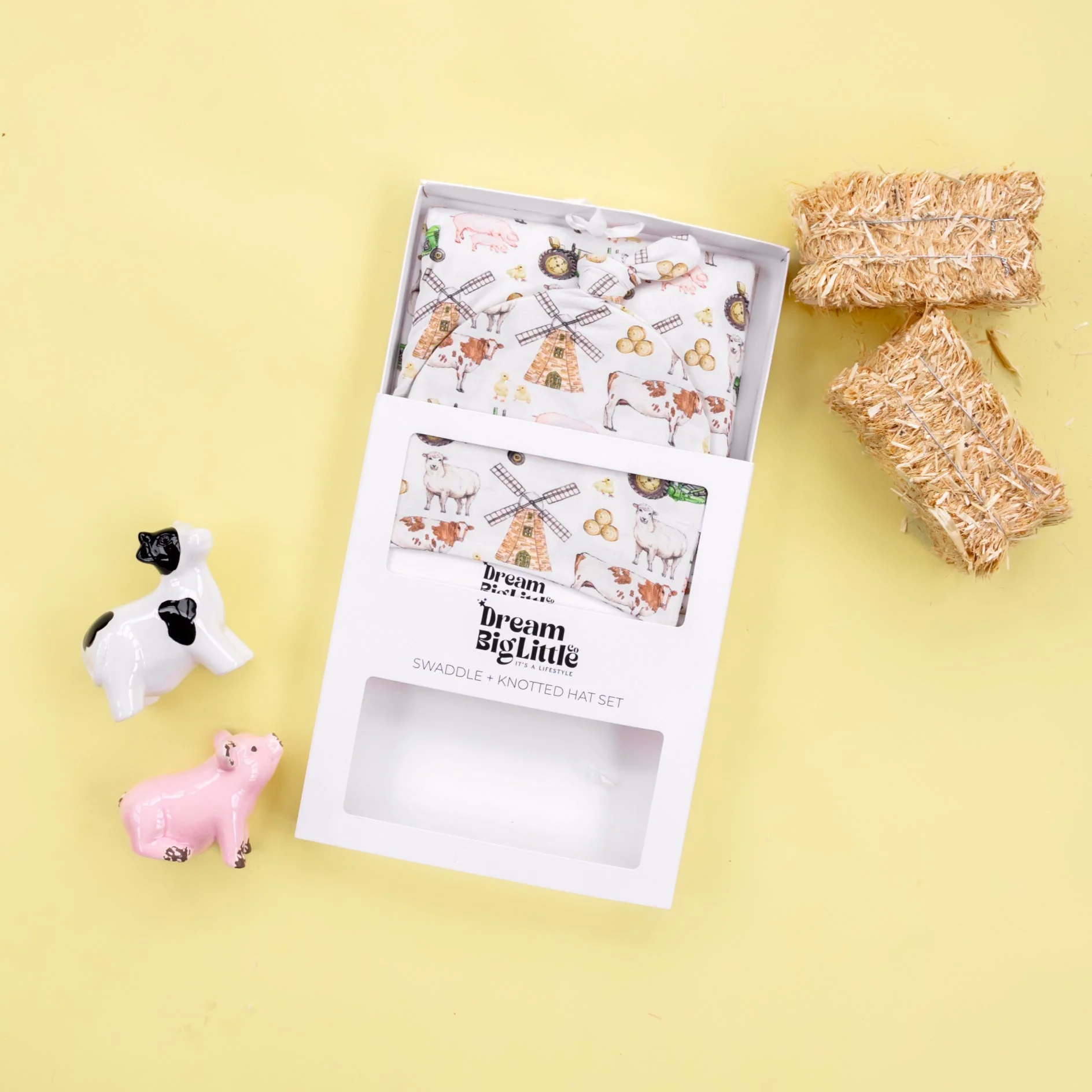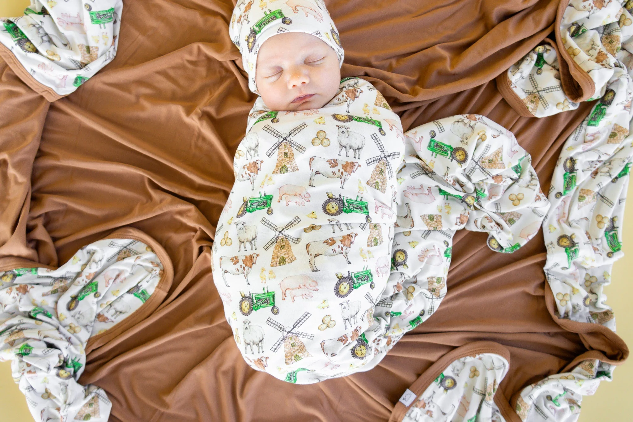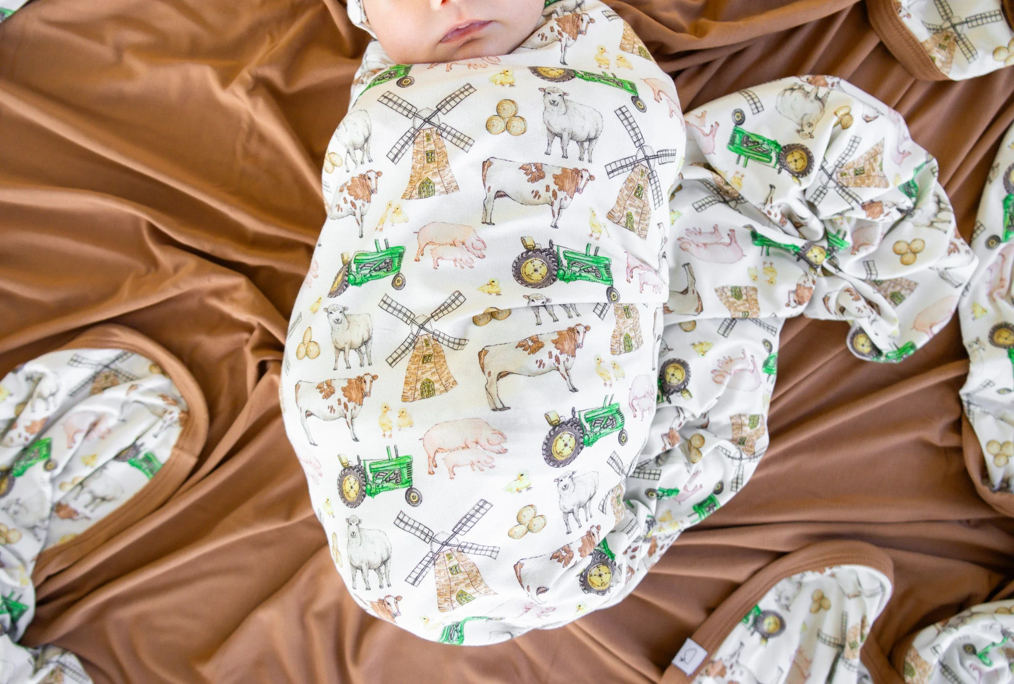 Introducing our Farm Lovin' Dream Swaddle & Beanie set, perfect for newborns. Made with bamboo material for ultimate comfort, this set features a charming farm print that will have your little one feeling the love. Say hello to your new favorite swaddle and beanie!