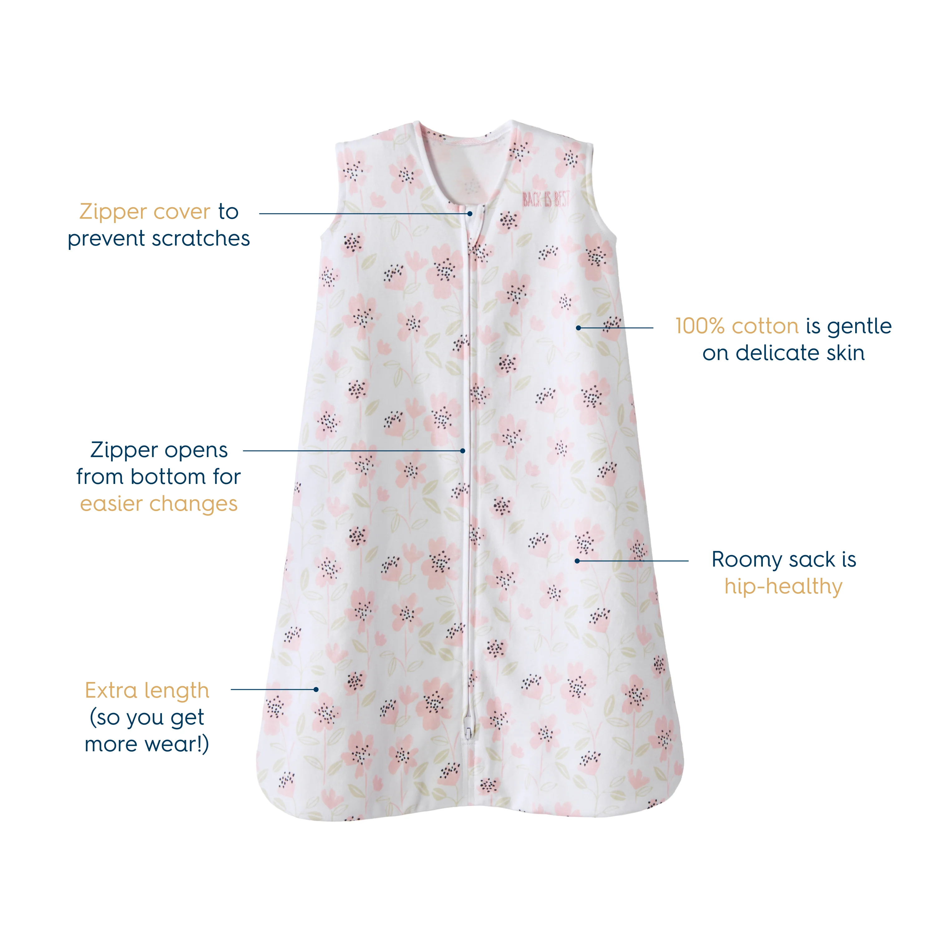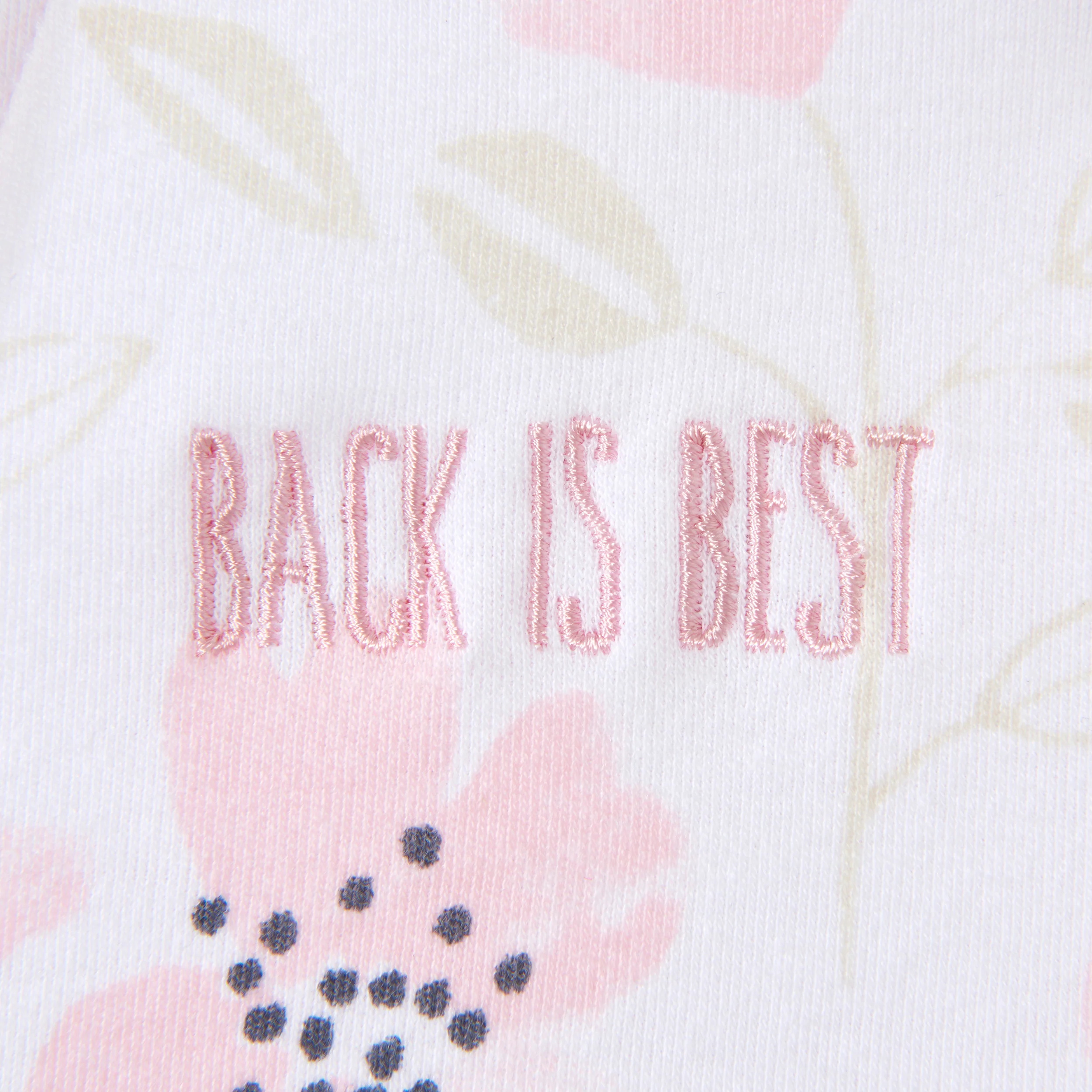 - Back is Best embroidery reminds caregivers to place the baby on his or her back