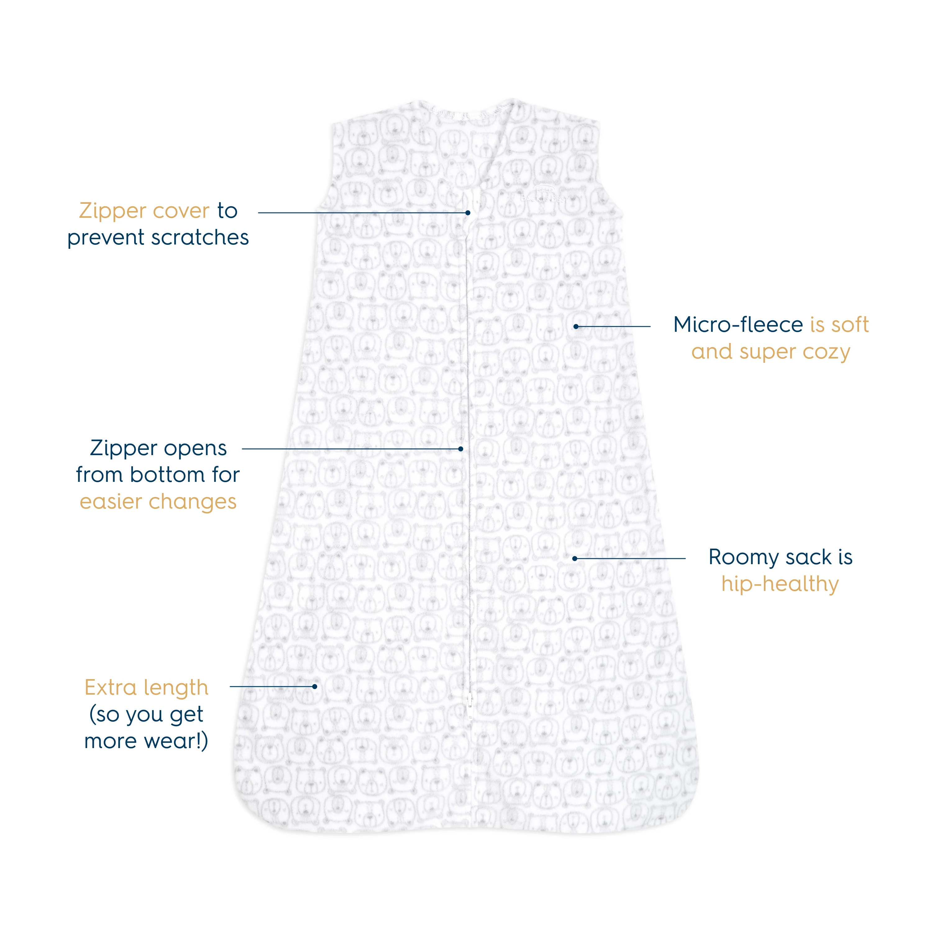 HALO®created the first SleepSack® over 20 years ago with both safety and comfort in mind. The #1 choice of 17,000 hospitals nationwide, our original wearable blanket with sleeveless design nestles baby like a soft blanket without the risk of sleep-related dangers. Signature “Back is Best” embroidery is a gentle reminder to place baby in the recommended sleep position. Features an inverted zipper for easy diaper changes and a roomy sack design that’s recognized by the International Hip Dysplasia Institute as promoting healthy hip development.