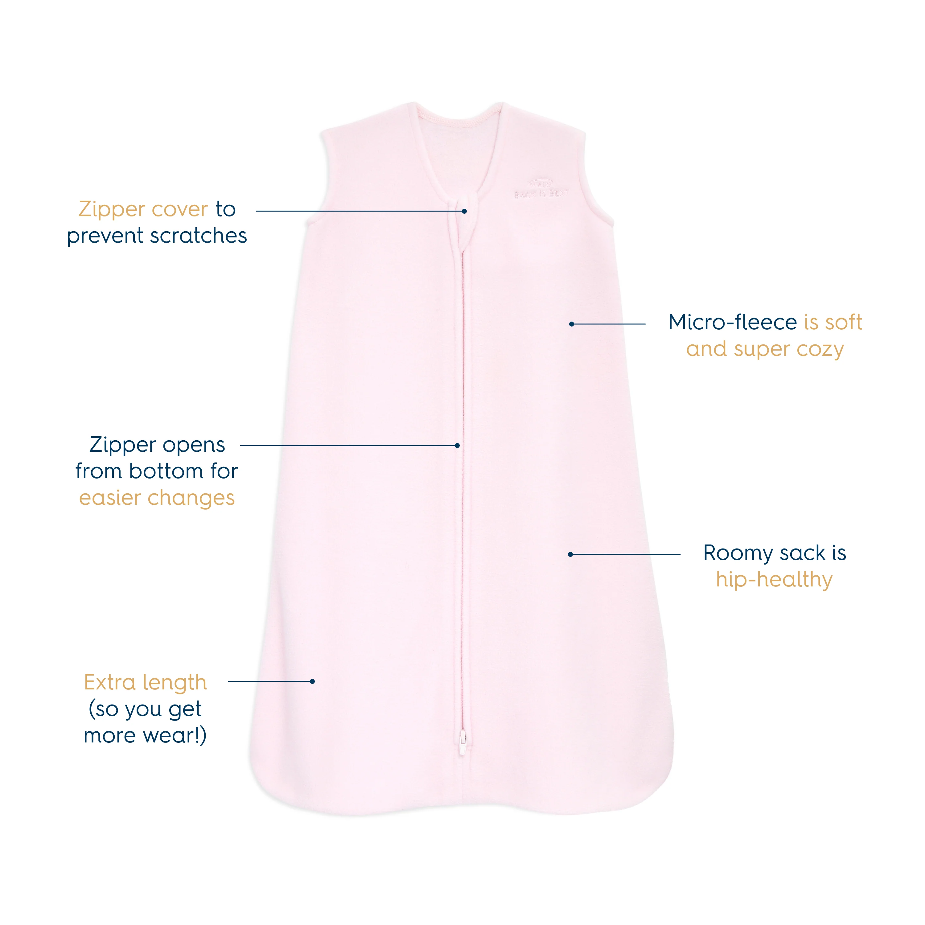 - Reverse zipper makes diaper changes easy and a special "Back Is Best" embroidered message reminds caregivers that on the back is the best position for a baby to sleep