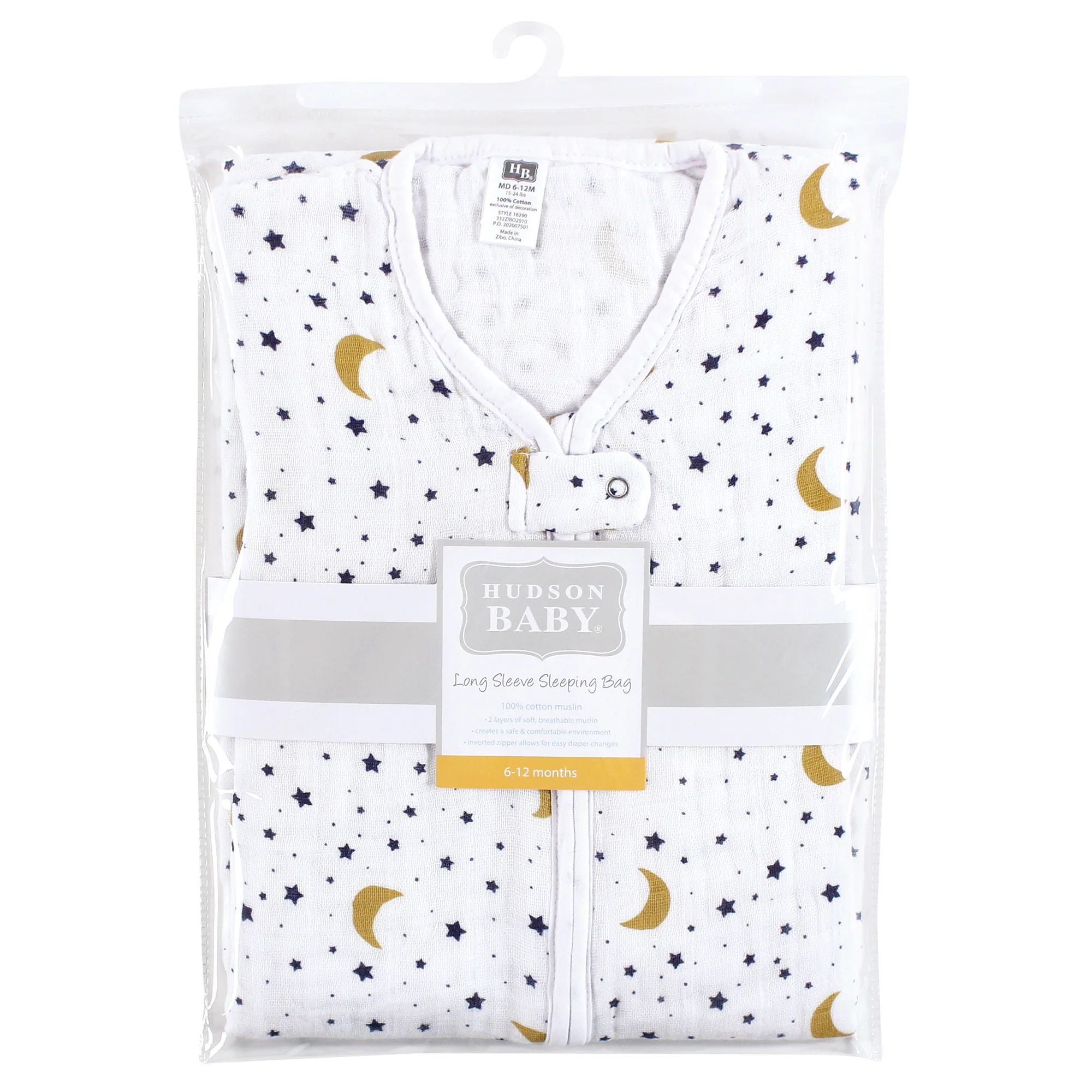 Hudson Baby muslin long-sleeve sleeping bag, wearable blanket, sleep sack is a great bedtime blanket for your little one. Made with 100% cotton, our wearable blanket will keep your little one feeling cozy, comfortable and secure through the night. Our long-sleeve, lightweight sleep sack is optimal for keeping your little one warm and comfortable but preventing overheating.