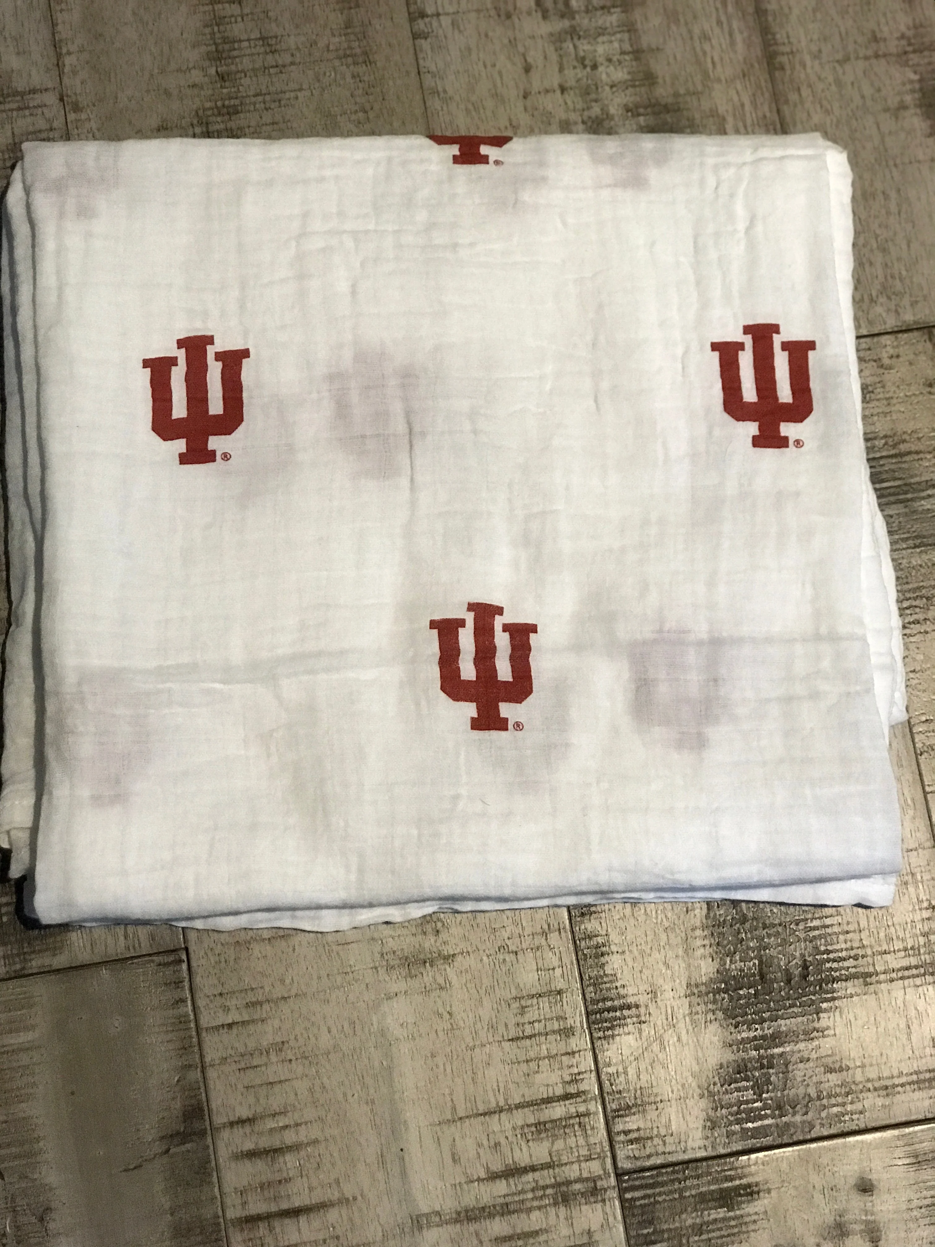 Officially licensed Indiana University Trident print 100% cotton muslin swaddle blanket. This blanket is generously sized (47x47in) that allows for longevity of use beyond the swaddle.