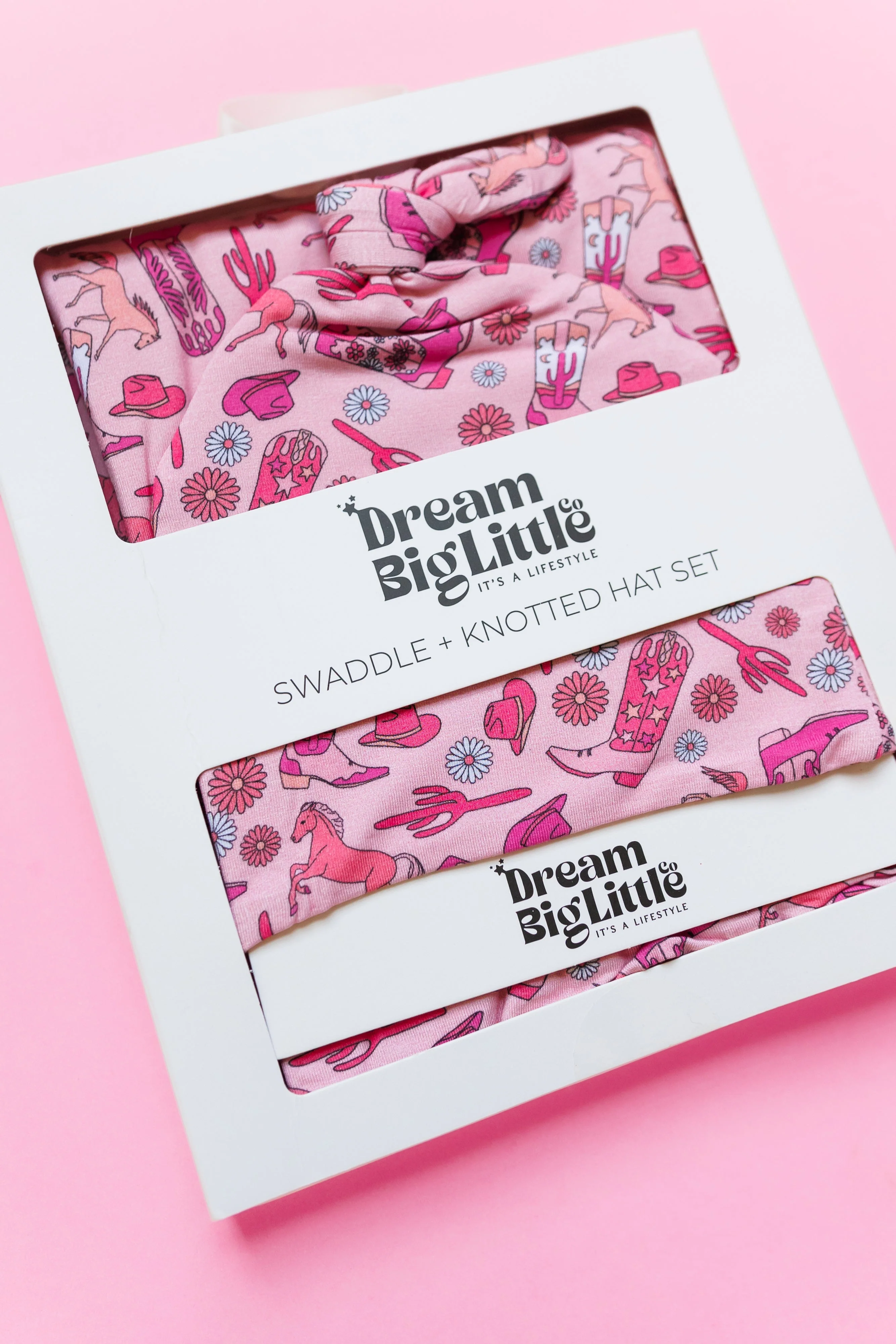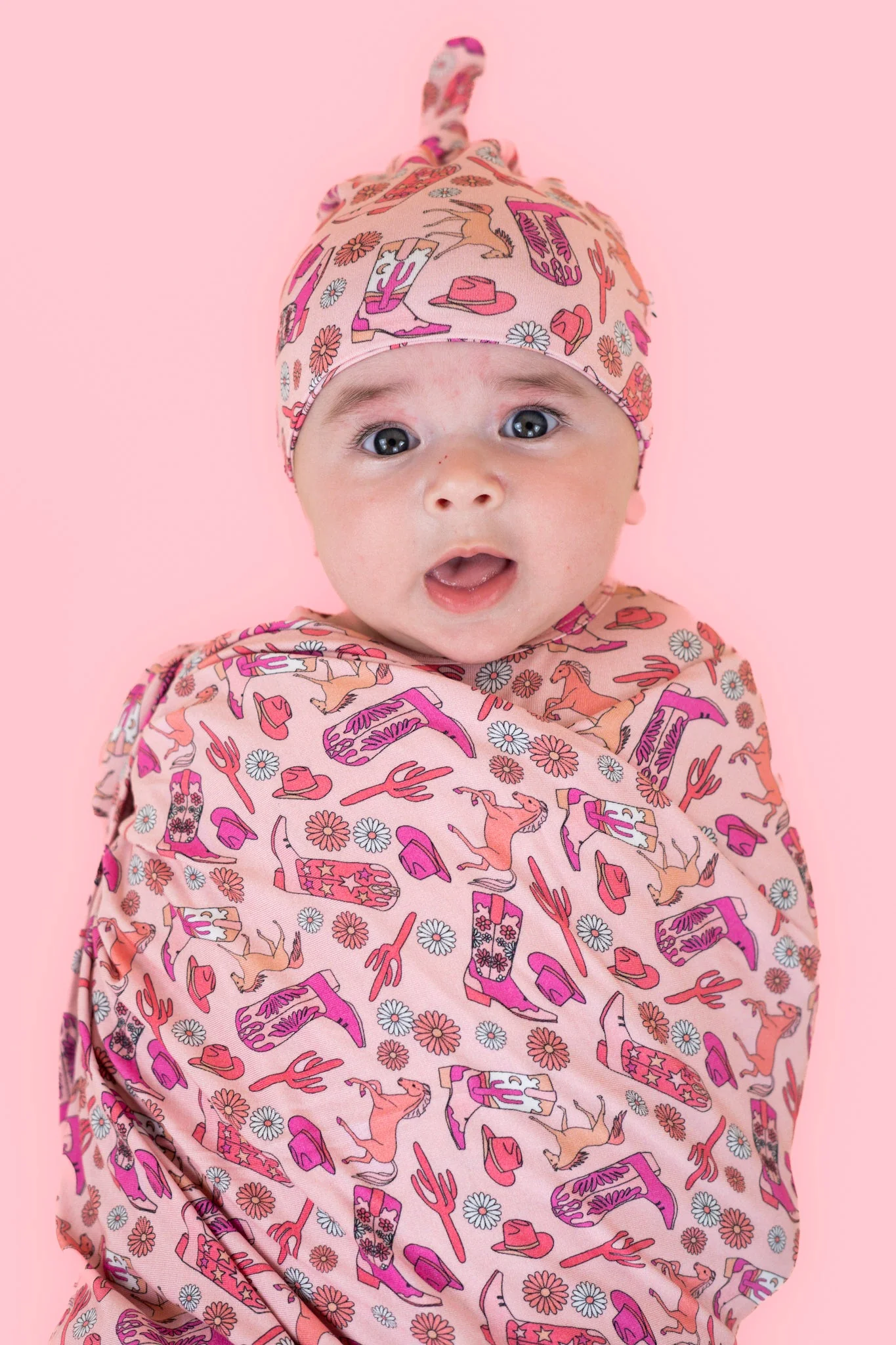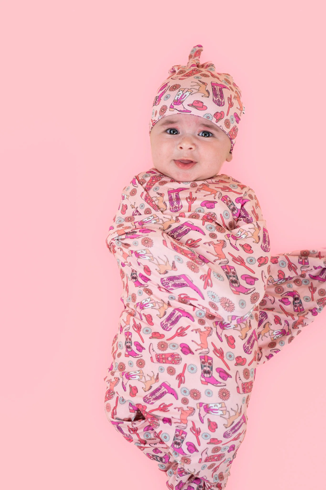 Introducing the Stay Wild Cowgirl Swaddle & Beanie set - perfect for your little one! This fun and playful set features a cowgirl print and boots, adding a touch of whimsy to any outfit. Made with soft and breathable bamboo, it's gentle on your baby's delicate skin. Yeehaw!