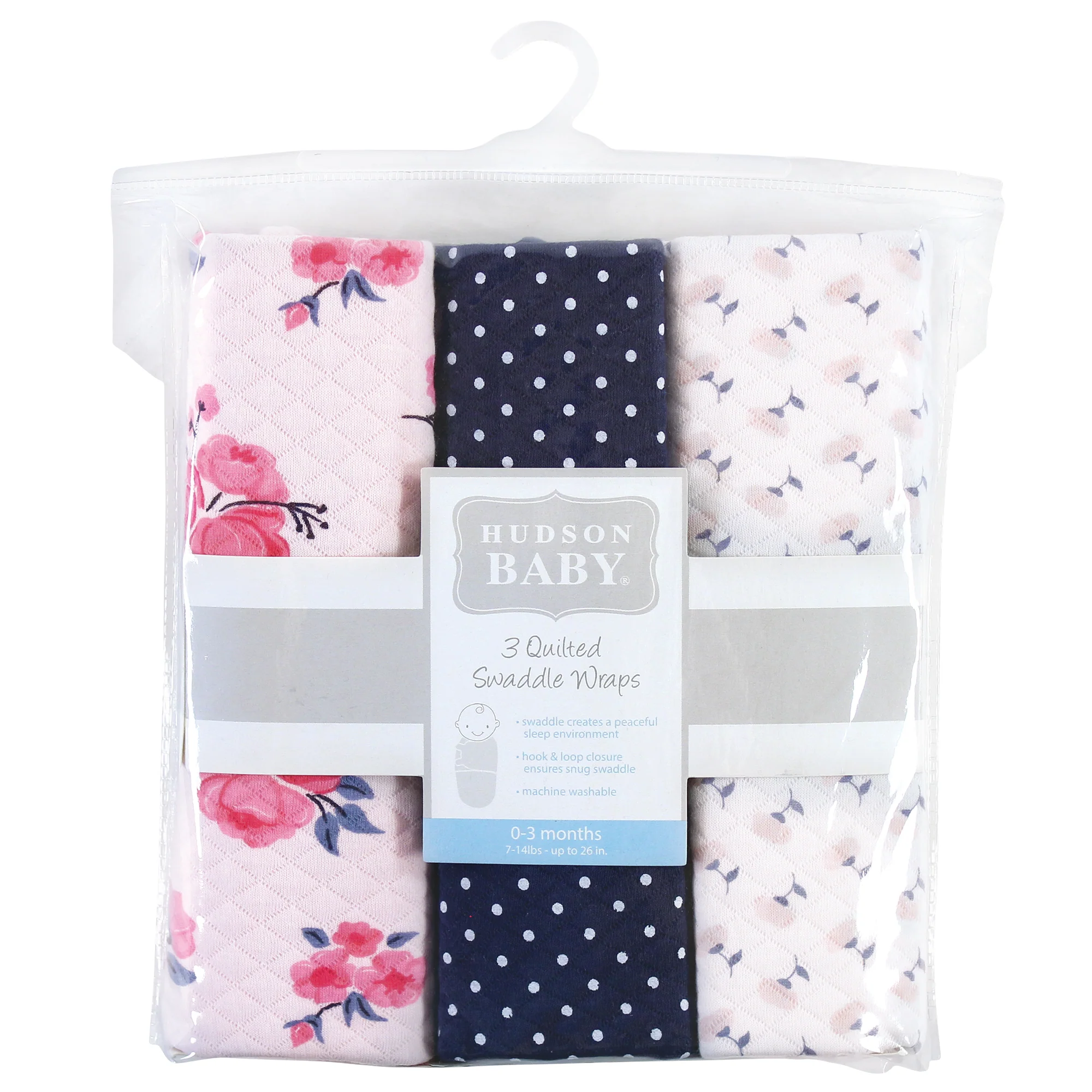 Hudson Baby Infant Girl Quilted Cotton Swaddle Wrap 3-Pack, Pink Navy Floral
