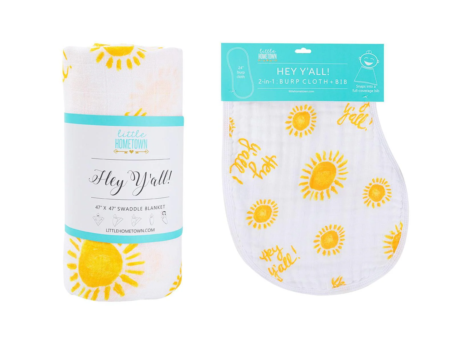 Little Hometown Gift Set: Hey Y'all Baby Muslin Swaddle Blanket and Burp Cloth/Bib Combo