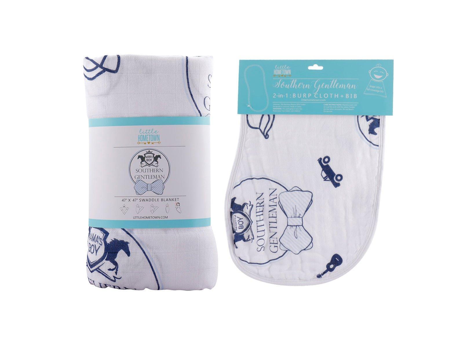 Little Hometown Gift Set: Southern Gentleman Baby Muslin Swaddle Blanket and Burp Cloth/Bib Combo