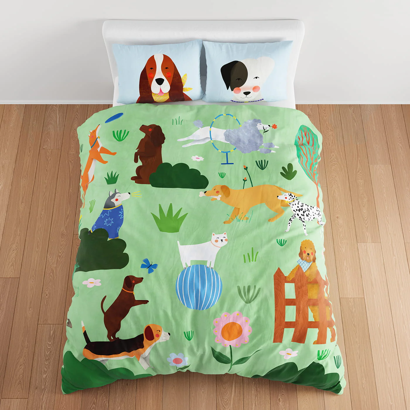 Illustrated by artist Laura Lhuillier, this playful design will be any dog lover's favorite bedding! Inspired by all the fun puppies have at the dog park, it's a colorful print that will put a smile on everyone's face. Soft to the touch, our duvet and pillowcase set is made to last. 100% cotton sateen, 230 thread count sateen weave, and fade-resistant. Our bedding is OEKO-TEX® certified and carefully crafted without harmful chemicals.