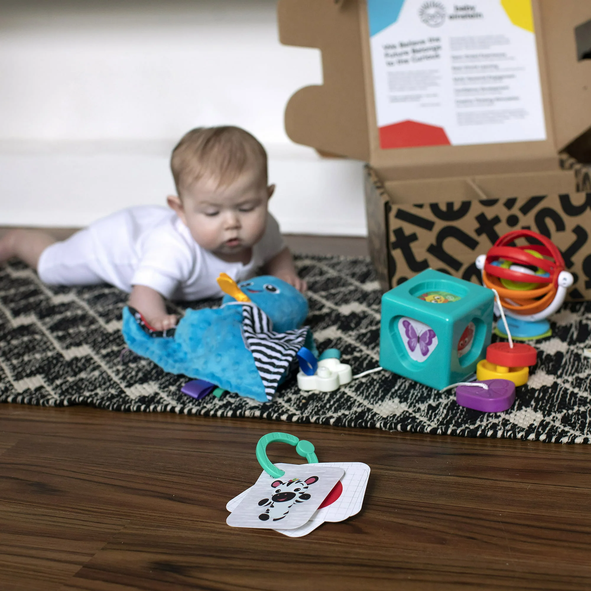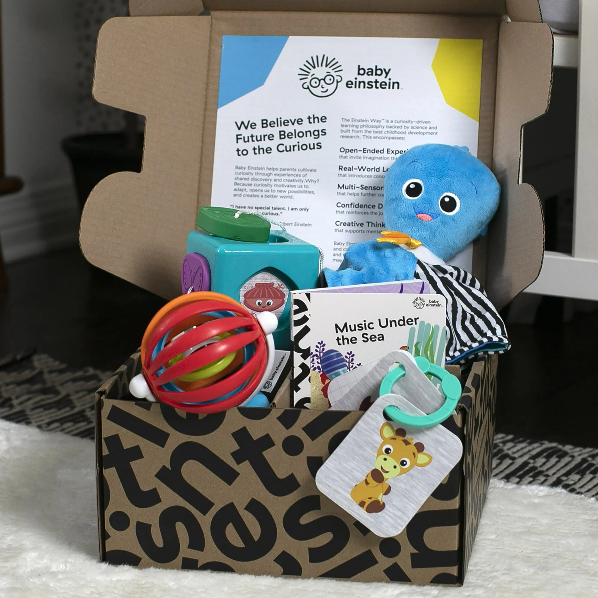 - Includes 8 pieces: 4 sensory and shape discovery toys; a board book; downloadable DIY activities; details for streaming Baby Einstein music on Spotify and edutainment videos on YouTube; and exclusive offers for Kinedu and Good Buy Gear