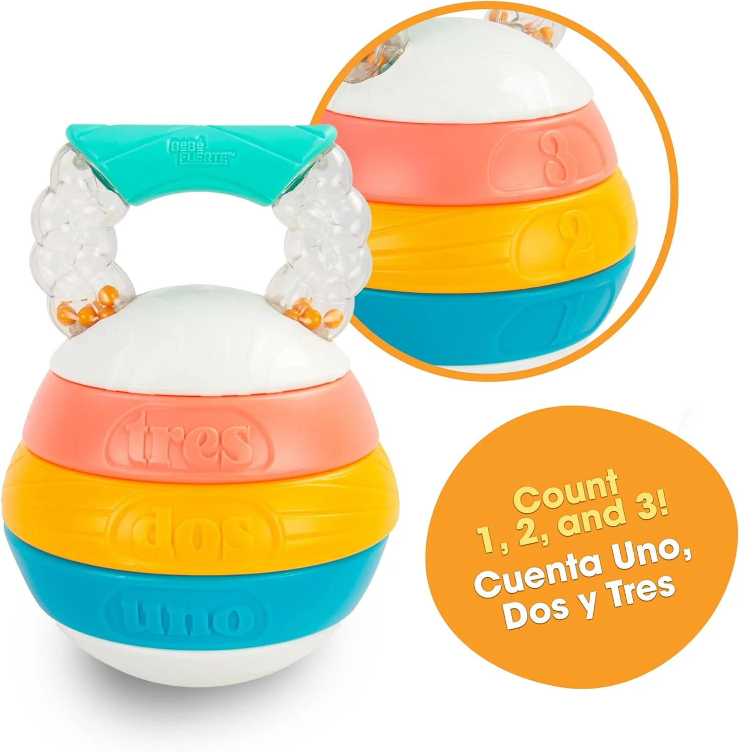 Welcome to Bebe Fuerte! Robin Arzόn, VP of Fitness Programming and Head Instructor at Peloton, believes in the power of movement for all ages and as a mom herself, was inspired to create this new collection of infant toys. Bebe Fuerte celebrates the magic that movement brings to baby and caregiver alike. Her Stack & Count Kettlebell is a classic stacking toy with a twist! The top twists onto the base to form a kettlebell shape and keep all the pieces together. Little ones can be just like their caregiver and “workout” with this baby kettlebell, but with the added fun of beads in the handle that make an enticing rattling sound as the kettlebell is moved. Ready to stack? Just twist off the top and place the pieces together for classic play that encourages both fine motor and problem-solving skills. Arzόn also leans into her Cuban-Puerto Rican roots with this toy by including the numbers 1-2-3 on one side and the words Uno-Dos-Tres on the other. It's a fun way to bring Spanish into playtime with your baby. When playtime is done, the twist that turns this stacking toy into a kettlebell also helps ensure that all pieces stay together and are easy to store away in one piece.