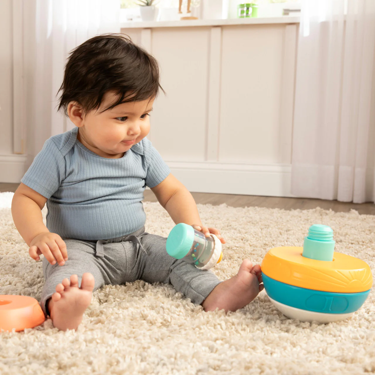 - Classic Stacking Toy with a Twist! Twist top onto the base to keep the pieces together and let baby join the work out fun with a kettlebell featuring fun rattling sounds