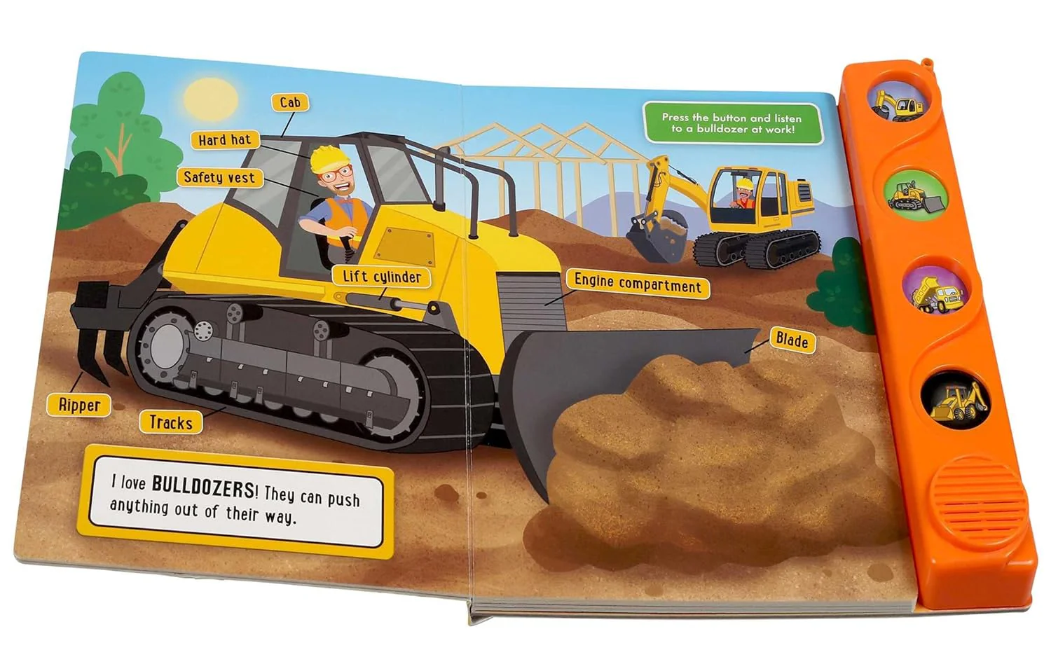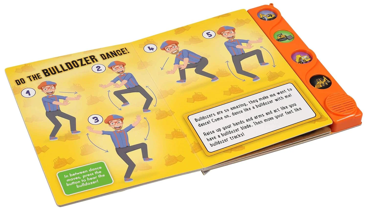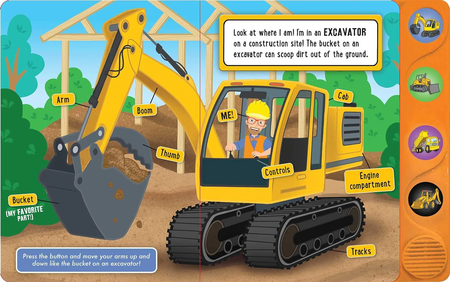 Join Blippi on a dirt-filled excursion in the "Blippi: At The Construction Site Book". The illustrated board book has 4 sound buttons that bring construction vehicles to life as Blippi dances his way through the work site.