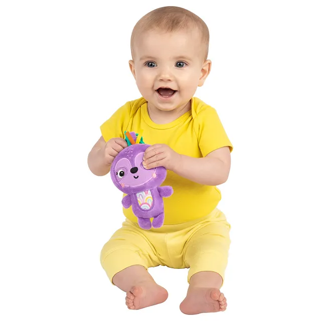 This sloth is up from his nap and ready to play! Your little explorer will love the Jingle Joy chime-along, tug-and-play rattle toy from Bright Starts. Pops of color and sound will have babies reaching, grabbing, and batting at their new purple sloth friend, while you enjoy watching babies practice developmental skills during their first year and beyond.
