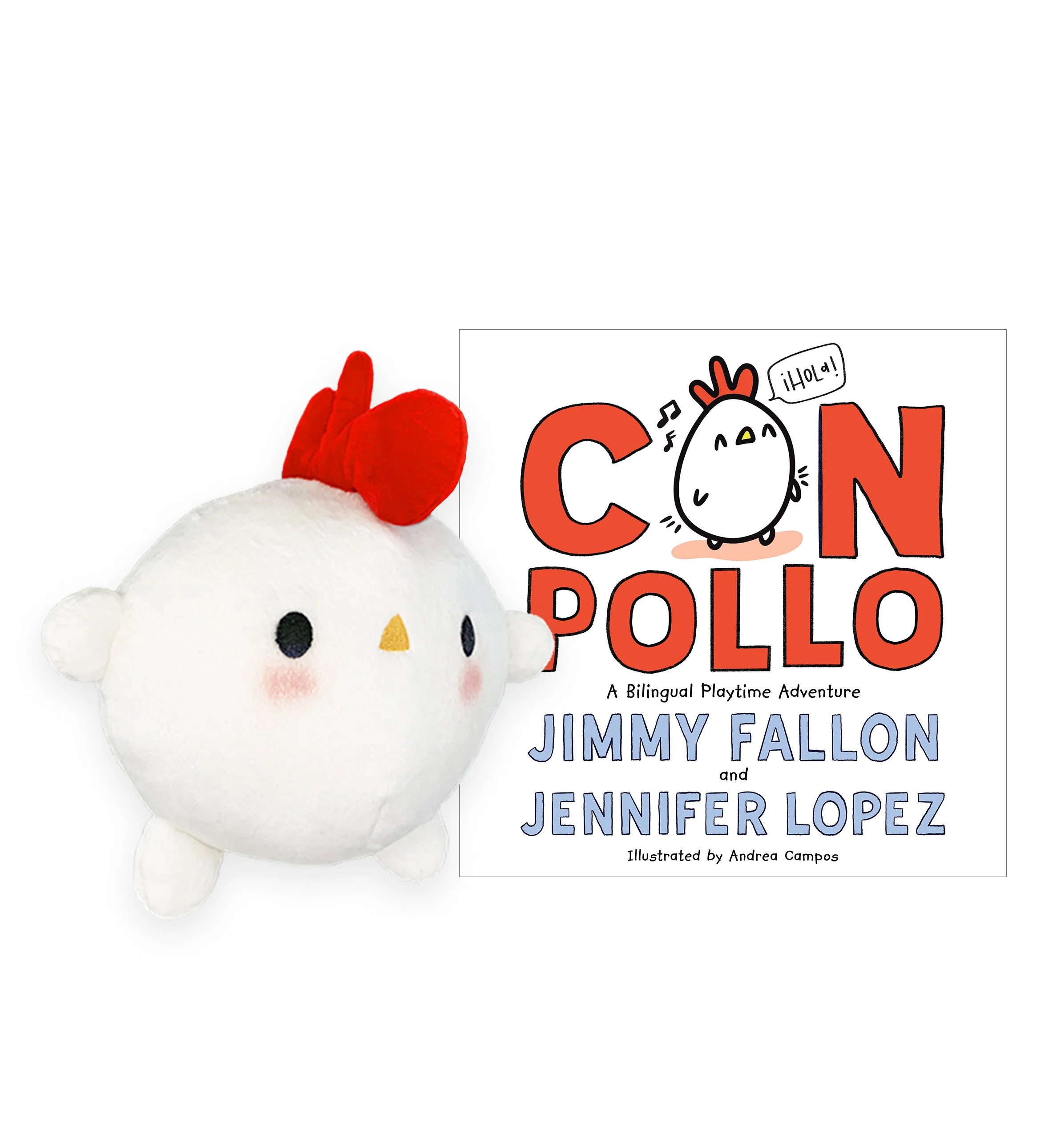 Hello! ¡Hola! This is Pollo. Pollo is a small white chick who loves to play and explore his way through this bilingual adventure from the multi-New York Times bestselling authors Jimmy Fallon and Jennifer Lopez. This oh-so-soft and oh-so-round Con Pollo Doll measures over seven inches and is topped with a bright red comb. Will you join Pollo as he reads and plays or leer y jugar?