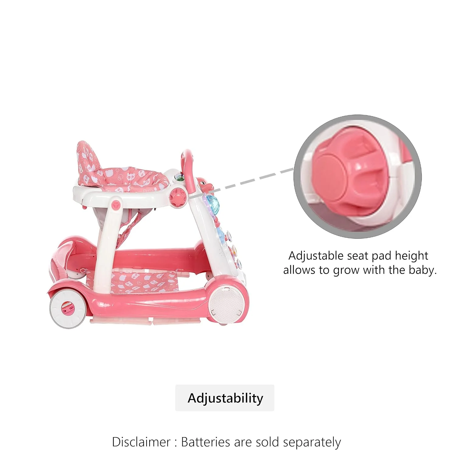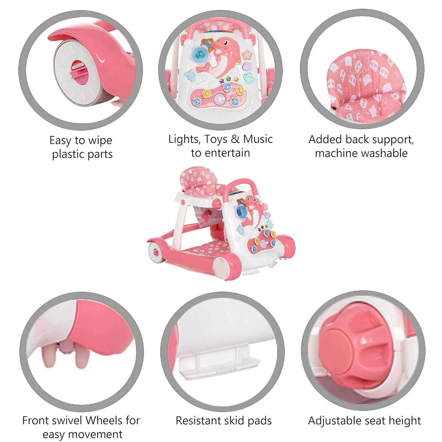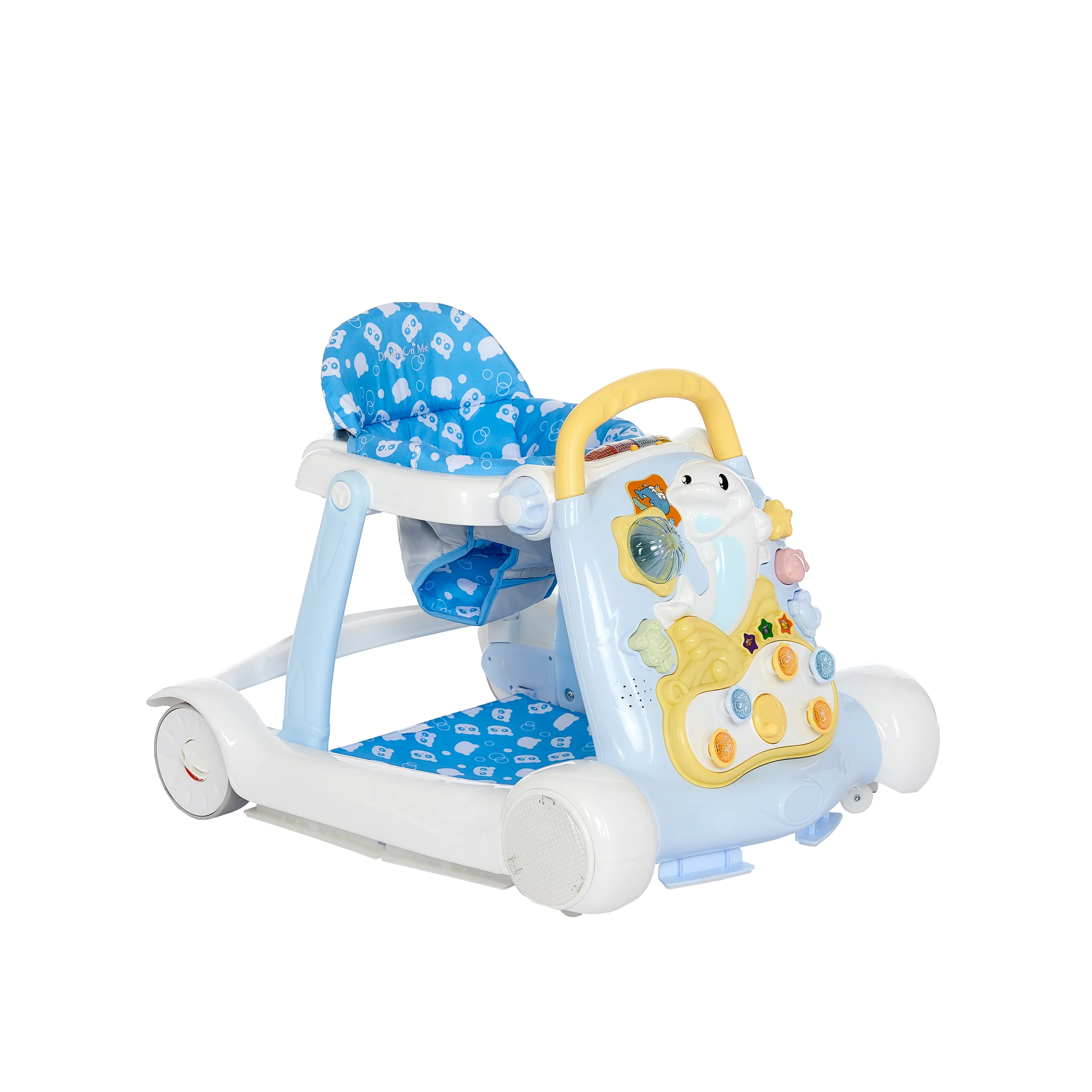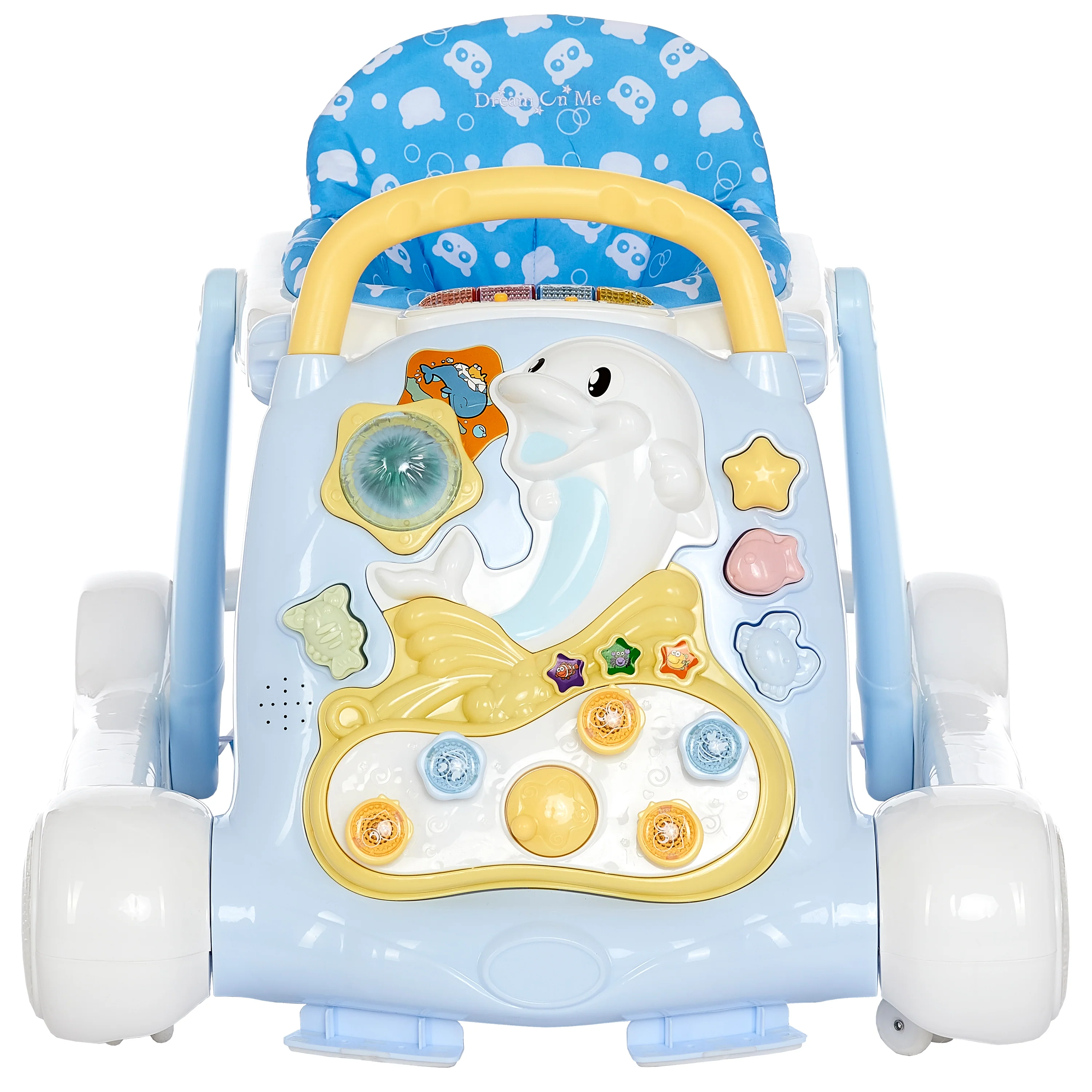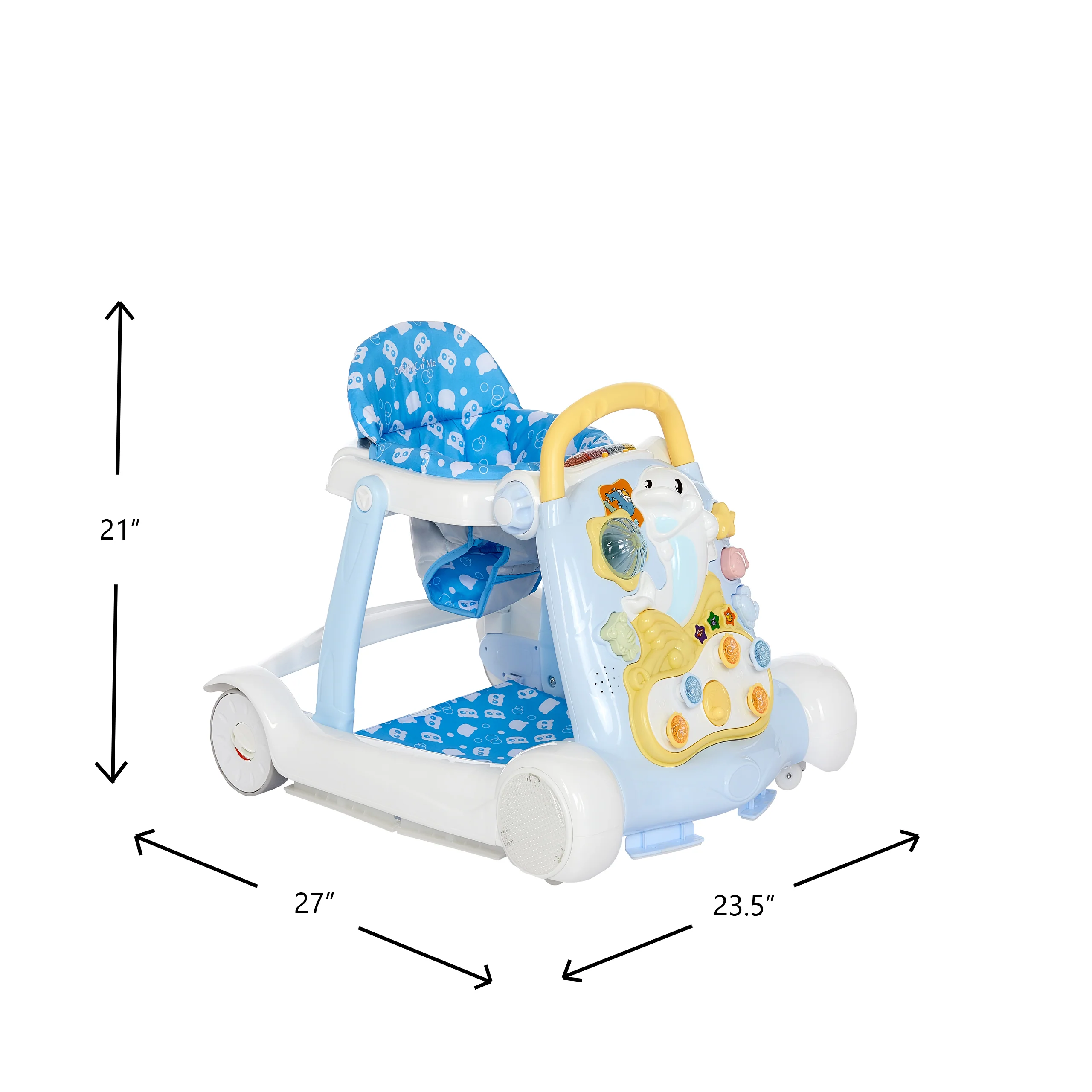 Help your baby discover the exciting world of walking with the Dream On Me Splash Walker & Activity Center. The seated activity walker makes for a great introduction to walking and when your child gets more confident, convert it into the walk-behind mode, and let your child push it around everywhere. The seated activity walker has flashy lights depicting different animal sounds; the front activity display toy tray includes a happy dolphin toy and music and songs for your child to enjoy! The high padded foam seat back lets your child sit upright unassisted. The adjustable seat pad height allows the Splash to grow with your baby. The pad is machine-washable and when you need to clean the plastic parts, simply wipe with a damp cloth using mild soap. The Splash comes in three attractive colors and prints that your child will love! The Splash comes with independent front swivel wheels for easy maneuvering. It has skid – resistant friction pads on the base for added safety. Product specs are 27L x 23.5W x 21H (inches) and it weighs 10.5 lbs. Please note for walkers that convert to activity center can have upto 24 months age range. For JUST walker function, it should be upto 12 months