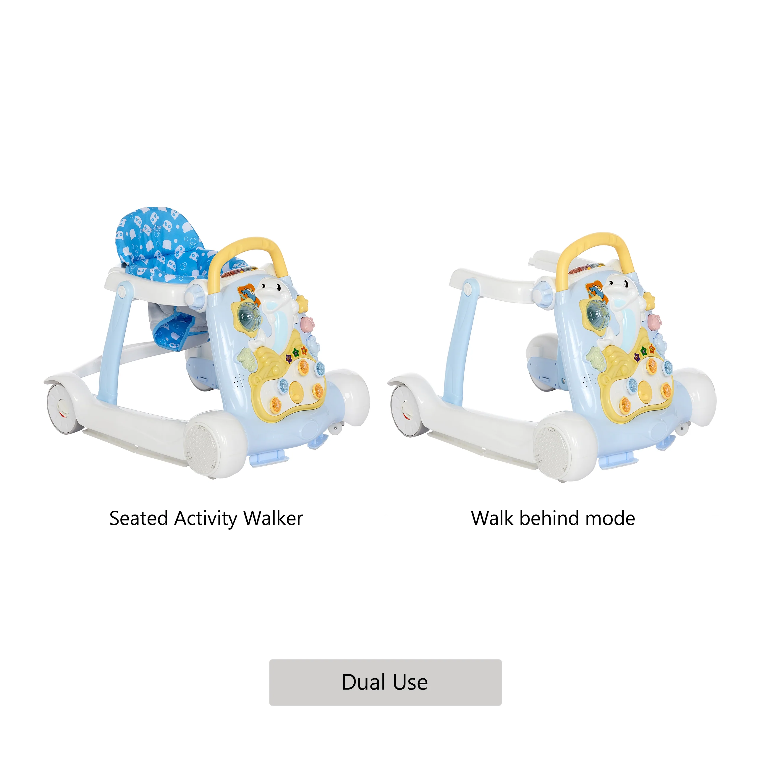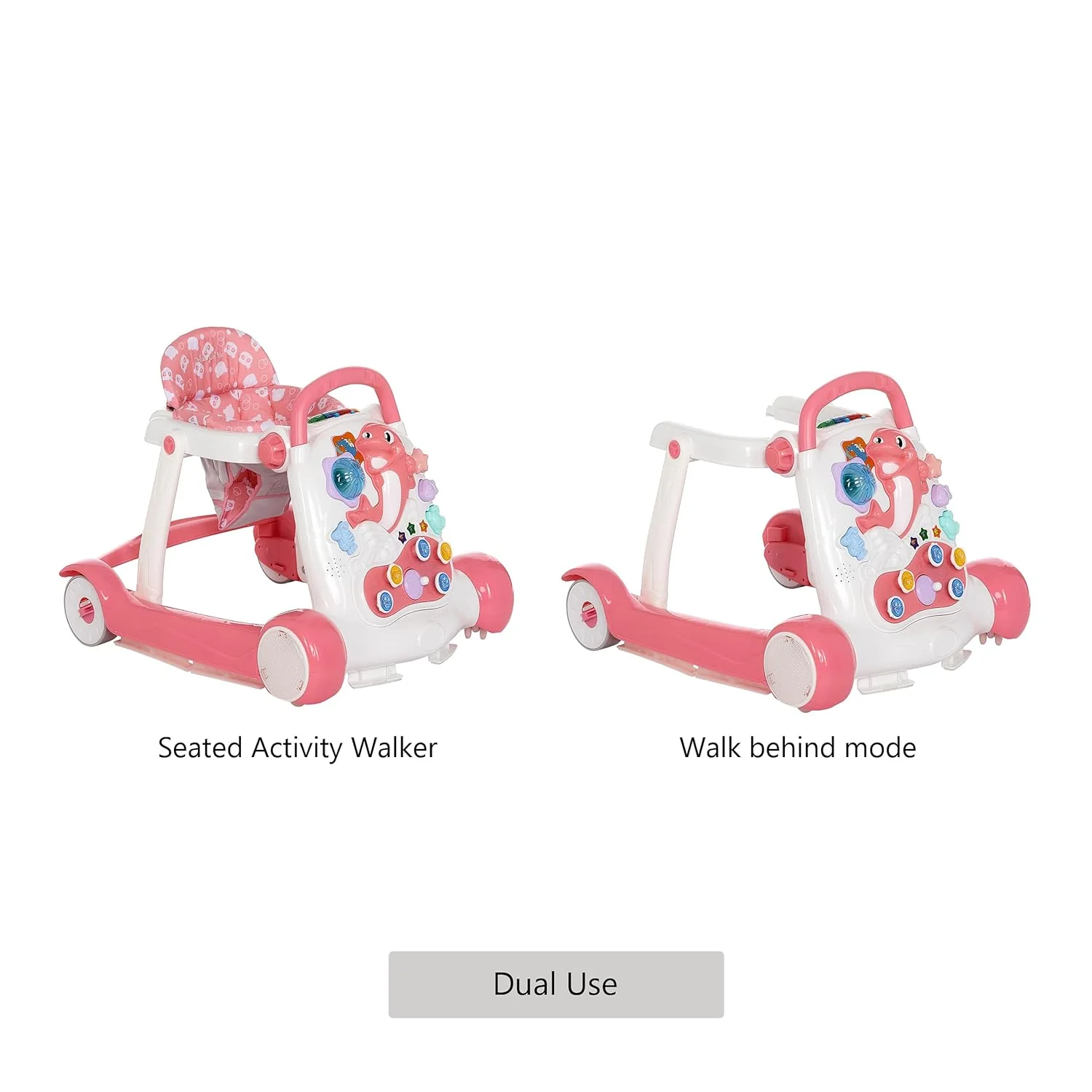 - UNLIMITED FUN:The seated activity walker has flashy lights with different animal sounds, while the front activity display toy tray includes a happy dolphin toy and tons of music for your child to enjoy! Ideal to develop your child’s fine motor skills!