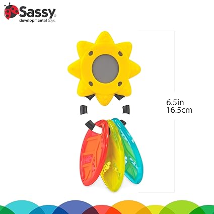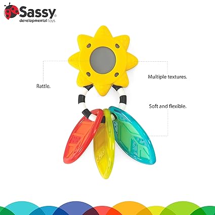 - Teethable sun layer with soft flexible materials captures a pleasant sounding rattle