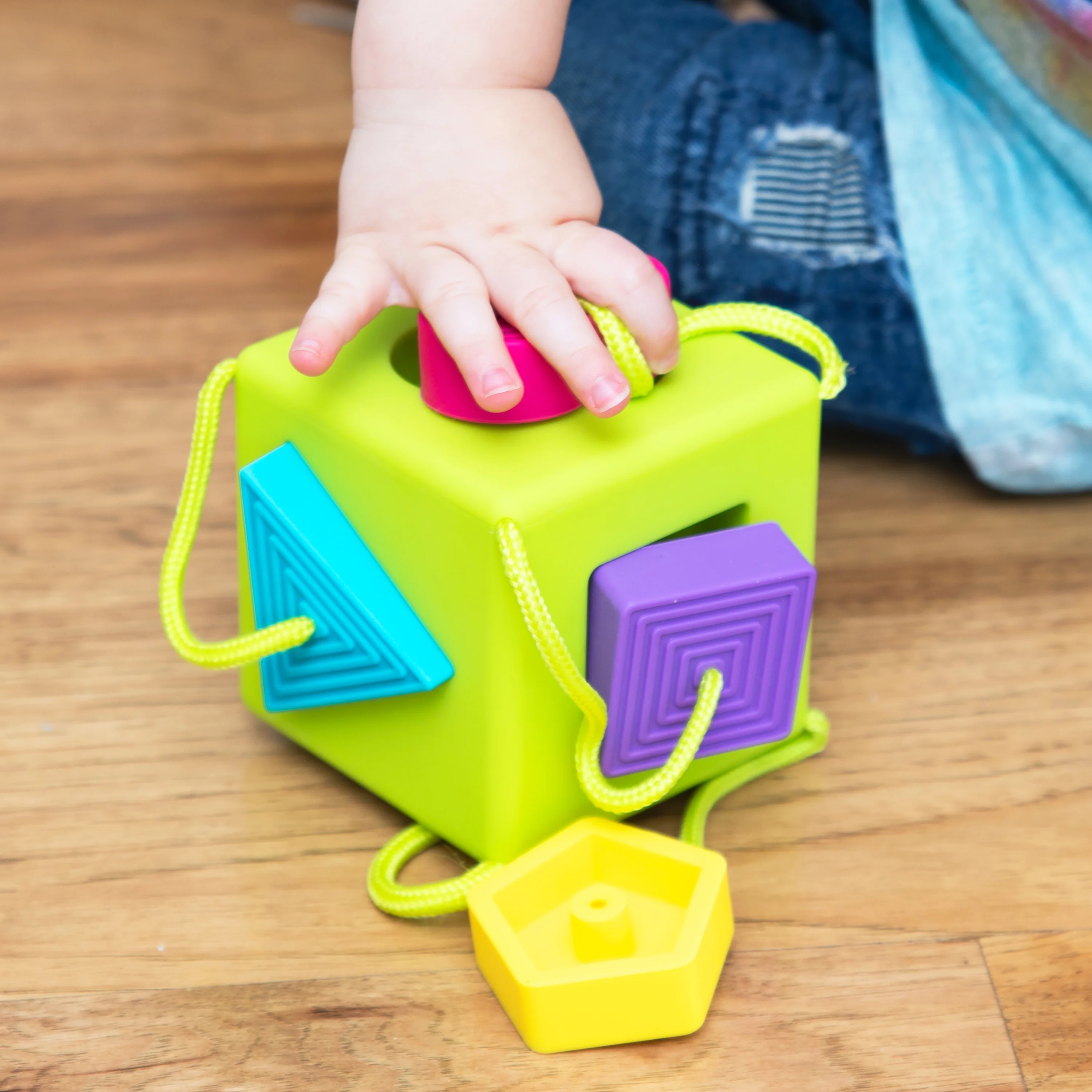 - The Fat Brain Oombee Cube Shape Sorter/Teether helps develop motor skills while providing a satisfying chew