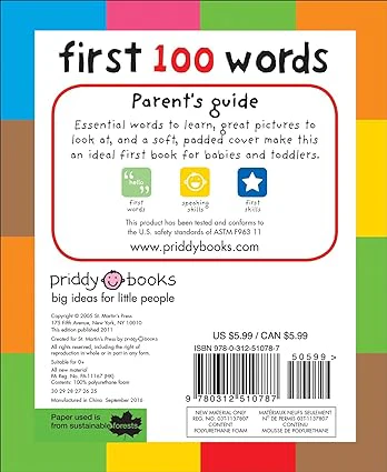 Your little one will soon learn some essential first words and pictures with this bright board book. There are 100 color photographs to look at and talk about, and 100 simple first words to read and learn, too. The pages are made from tough board for hours of fun reading, and the cover is softly padded for little hands to hold.