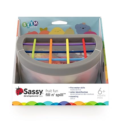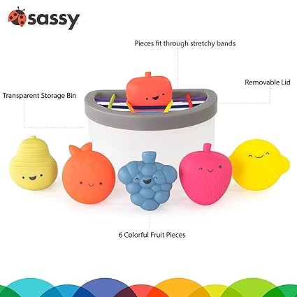 Have your little one explore their tactile development with the Sassy Fruit Fill & Spill Textural Fruits 6-Piece Set. The fruits are textured and your baby will be able to learn fruits, colors, and more all the while having some teething relief.