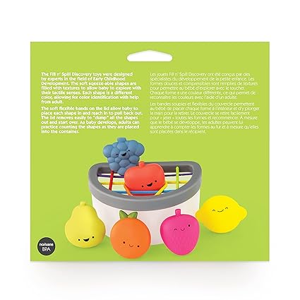 - Learn each fruit’s shape and color, and fill up the container to spill out the contents