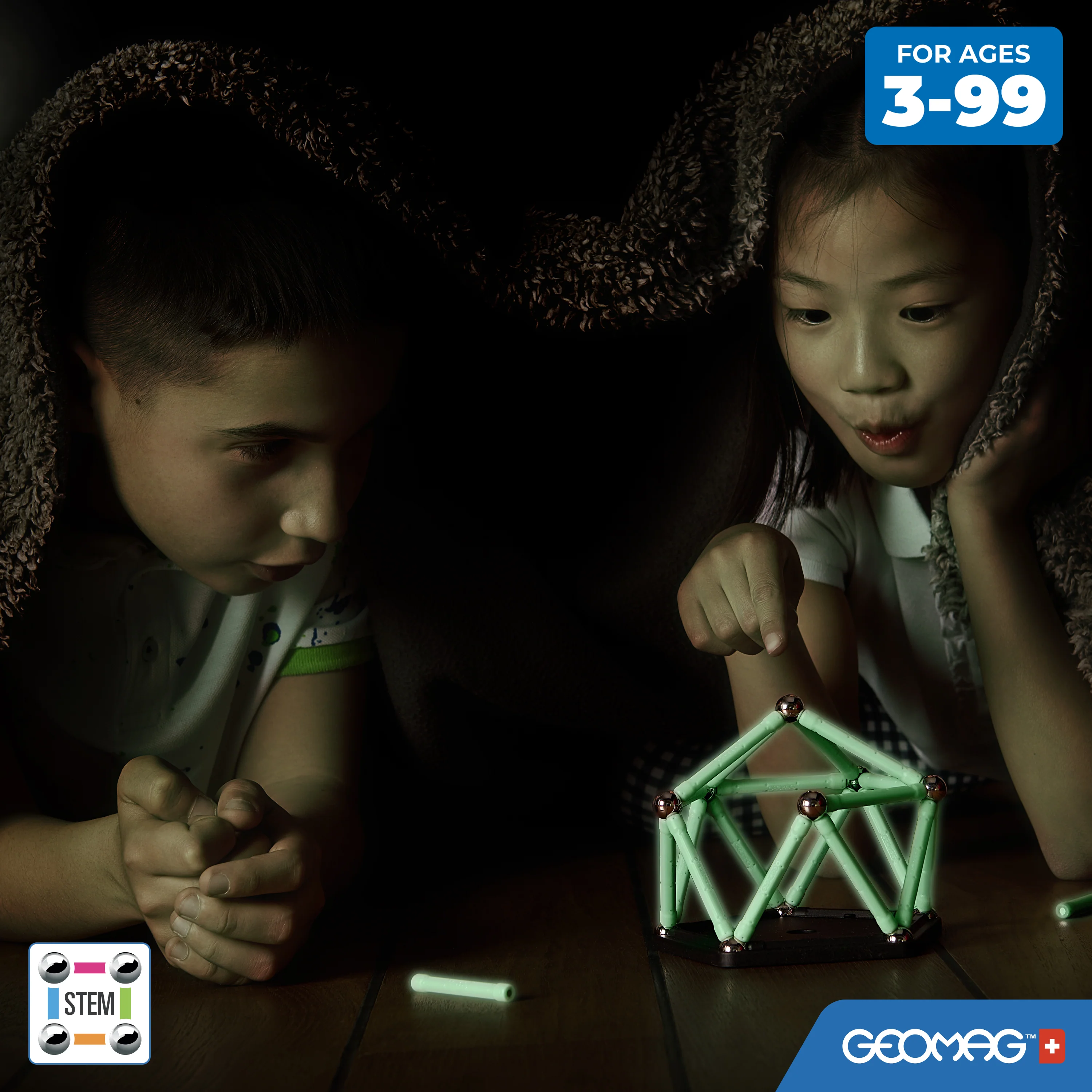 The GLOW line allows you to watch your Geomag models light up at night thanks to the amazing GLOW effect of natural luminescent materials that capture and return the sunlight.