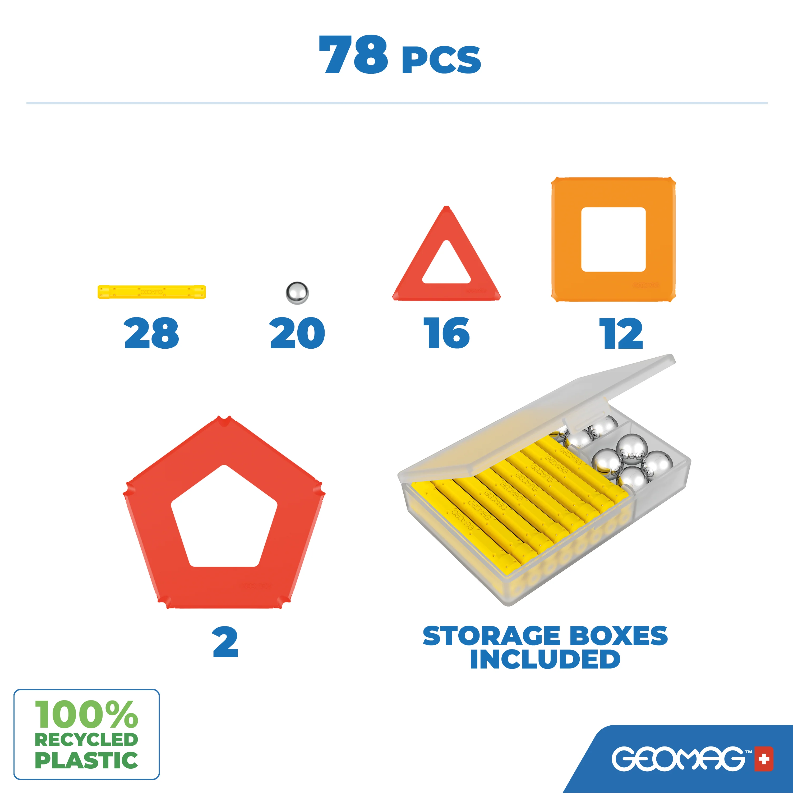 Safety and convenience are also at the heart of the Geomag Panels Recycled 78-Piece Set. The strong magnets ensure stable constructions, while the smooth, durable recycled plastic is gentle on little hands. And when playtime is over, tidying up is a breeze with the included storage box, promoting responsibility and organization.