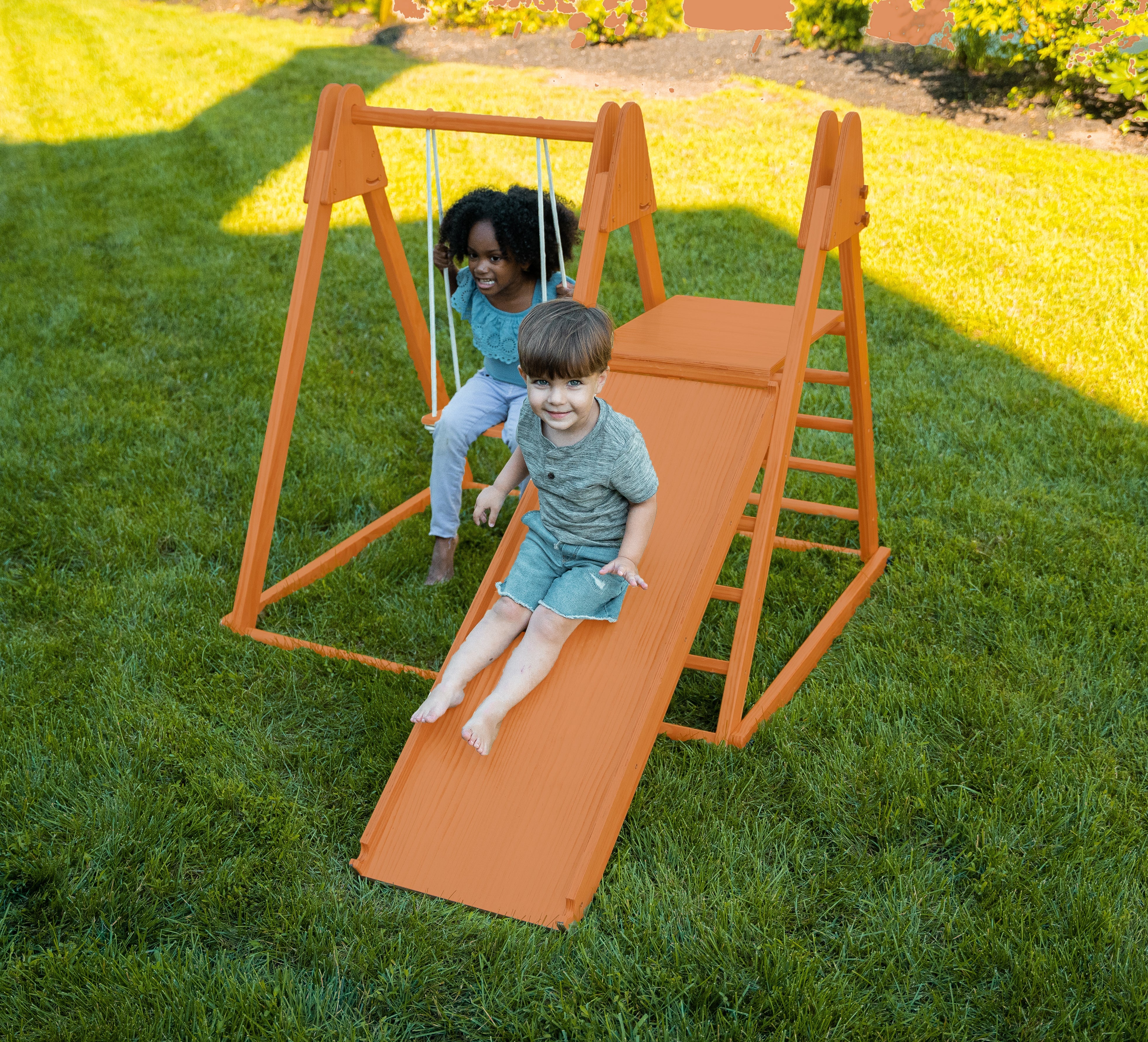The Juniper combines safety, functionality, and fun in our 4-1 wooden playset.