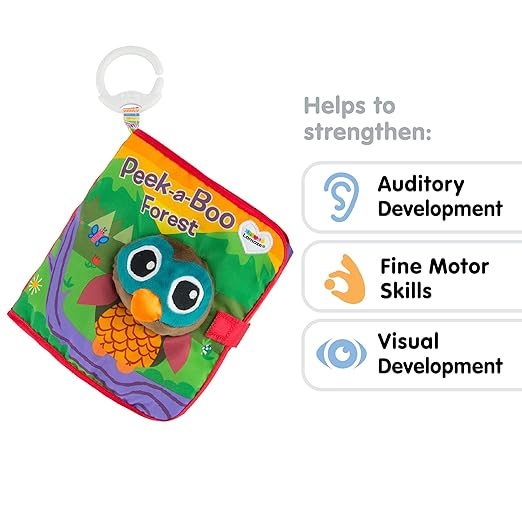 Travel through the forest and spot the hidden animals. Crinkling peek-a-boo pages keep baby involved and intrigued. Hand-eye coordination improves as they flip the fabric flaps and point to the hiding animals.