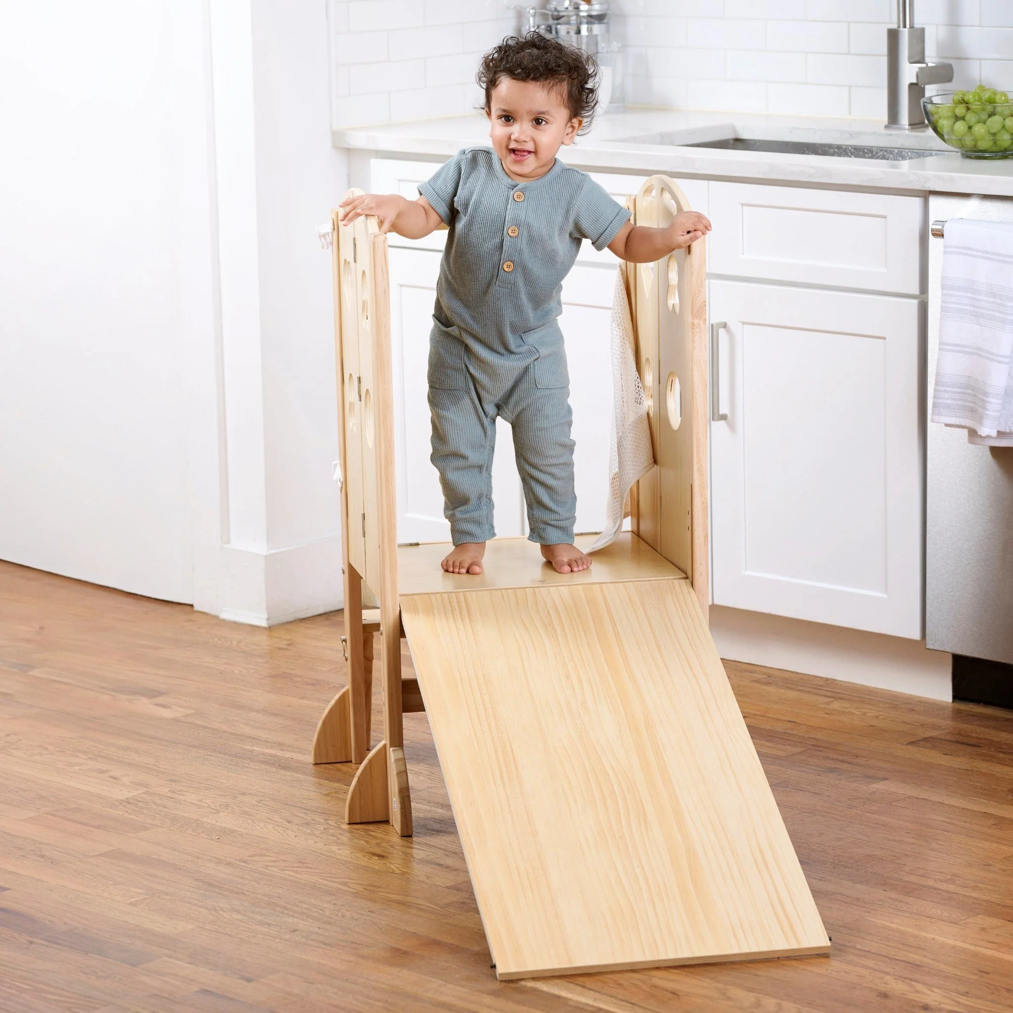 Slide for Playful Moments: The inclusion of a slide ensures that the kitchen tower is not only practical but also fun. The slide feature can be folded away when not in use, maintaining the compact foldable design.