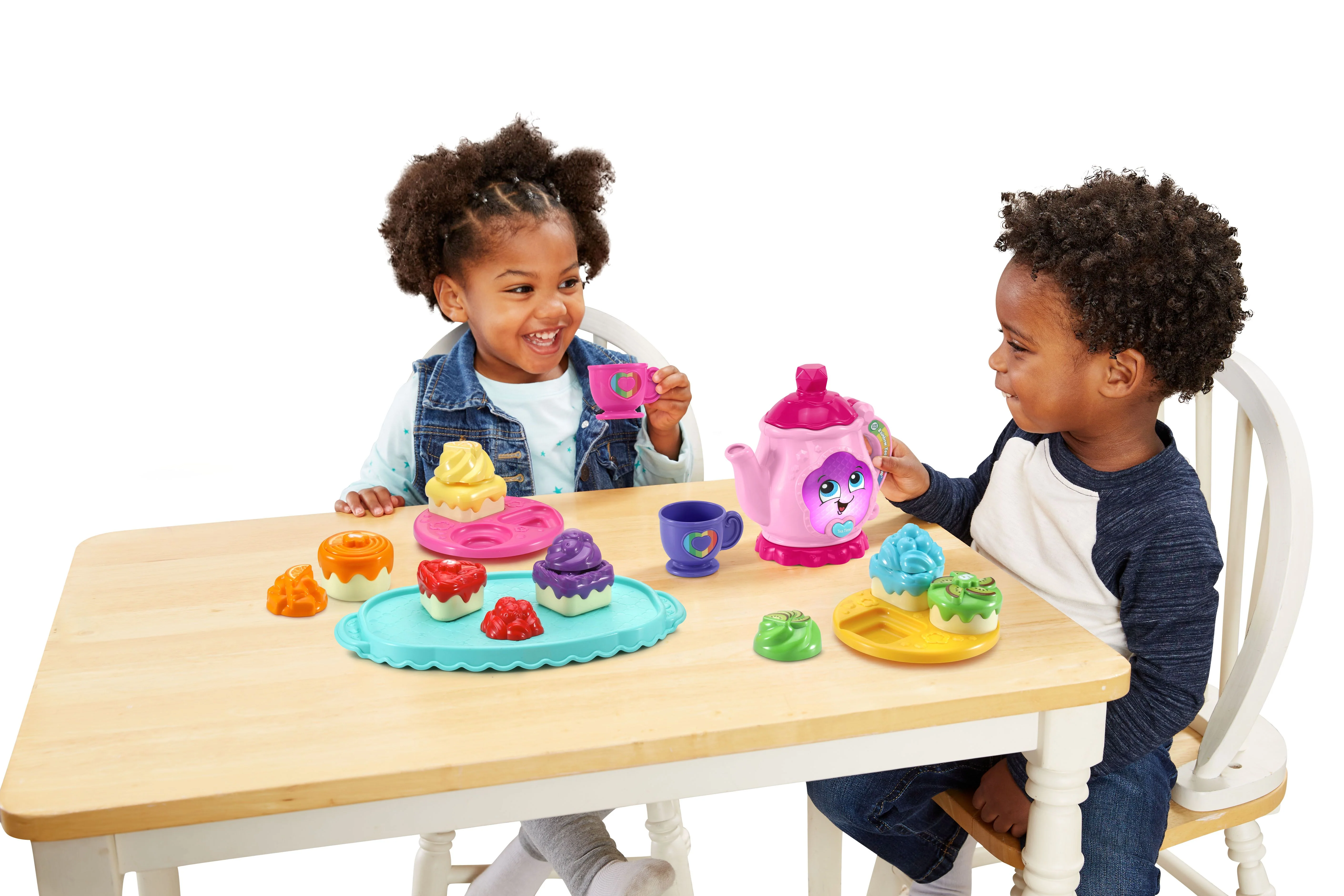 Throw a tea-riffic party with the rainbow tea for two set this peppy, light-up teapot makes tea parties magical by introducing colors and numbers or playing music for two ways to play. Lift the peek-a-boo lid to change tea flavors and smile in the mirror.