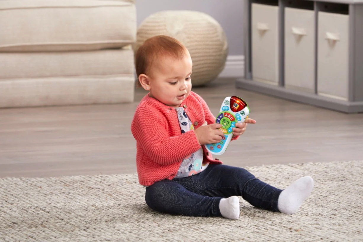 Learning is on every channel with Scout’s Learning Lights Remote role-play toy. Explore all 17 buttons on the learning remote to hear more than 100 phrases, sounds and music while building fine motor skills. Flip between modes for role-play excitement or learning activities that introduce numbers and letters. Silly pretend channels inspire imaginative play. Switch to the Spanish channel to hear common Spanish phrases, listen and dance to three different music styles on the music channel and hear rain, snow and wind sound effects on the weather channel. Intended for ages 6+ months. Requires three AAA batteries. Batteries included for demo purposes only, new batteries recommended for regular use.