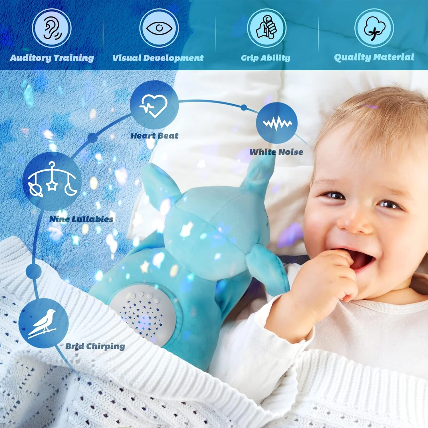 - 9 LULLABIES AND 3 SOOTHING SOUNDS: with white noise, heartbeat, and chirping birds, adjustable volume for customized sleep, it has three designs with adorable blue elephant, pink unicorn and a white lamb plush animals.