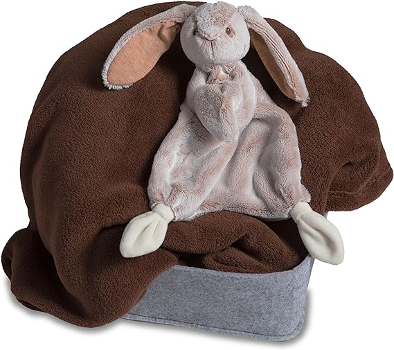 - Bunny's relaxed body is luxurious fabric in frosted tan with white knotted feet; lovey snuggles with its own attached blanket