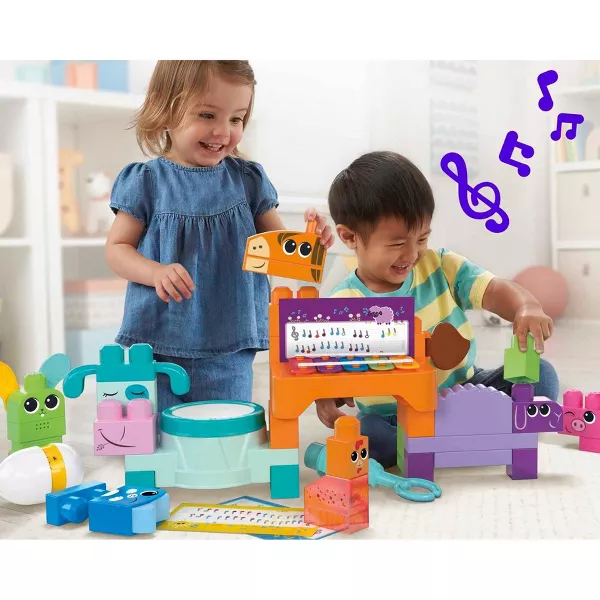 Toddlers will dance for joy when they build the Musical Farm Band with 10 sensory features to discover. They can build 8 farm animals, each with their own musical feature: a horse xylophone, cow drum, chick rattle, piggy cymbal, sheep guiro, cat clicker, rabbit squeaker and egg castanet. Then, they can join the band and learn to play 6 nursery songs that can help develop rhythm and melody.