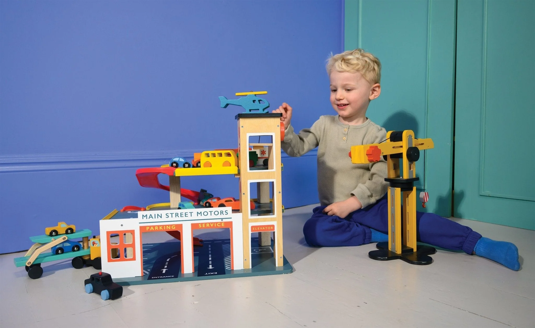 Main street Motors is open for business, a sturdy wooden toy garage with 3 levels and 2 ramps, a working lift to take 2 little toy cars up and down. Strong and brightly painted, there is also a helicopter and helicopter pad on top of the lift shaft. Each parking level is decorated with parking bays, and there is plenty of access all round for little hands to get in and manoeuvre the cars around.