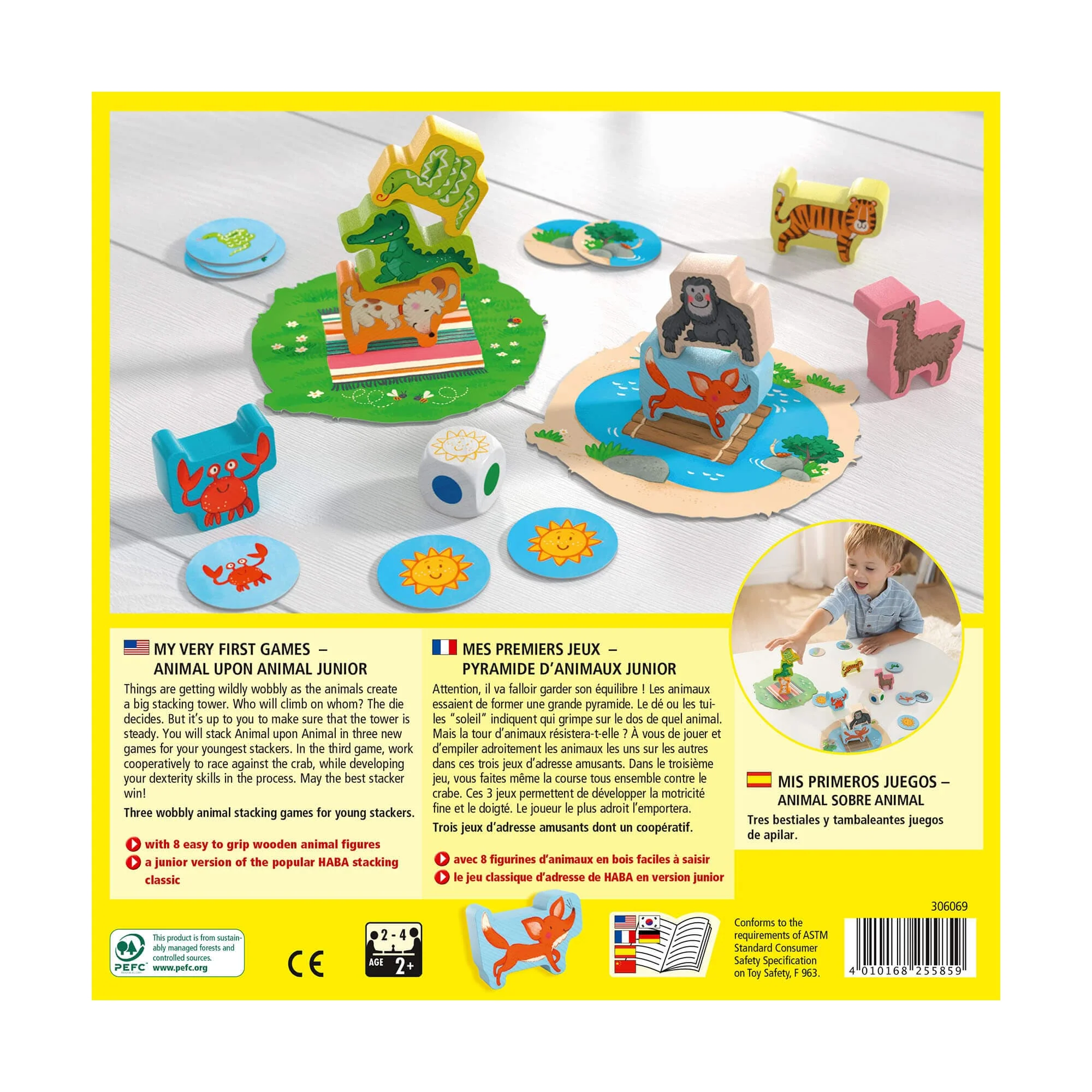 Things are getting wildly wobbly as the animals create a big stacking tower. Who will climb on whom? The die decides. But whether the animal stack stays standing or not is up to the players. They stack Animal upon Animal in three new games for young stackers. In the third game, they work cooperatively to race against the crab, training their dexterity skills with play. May the best stacker win!