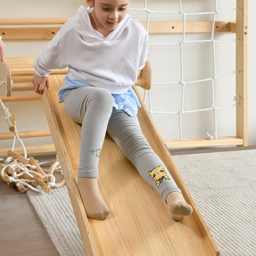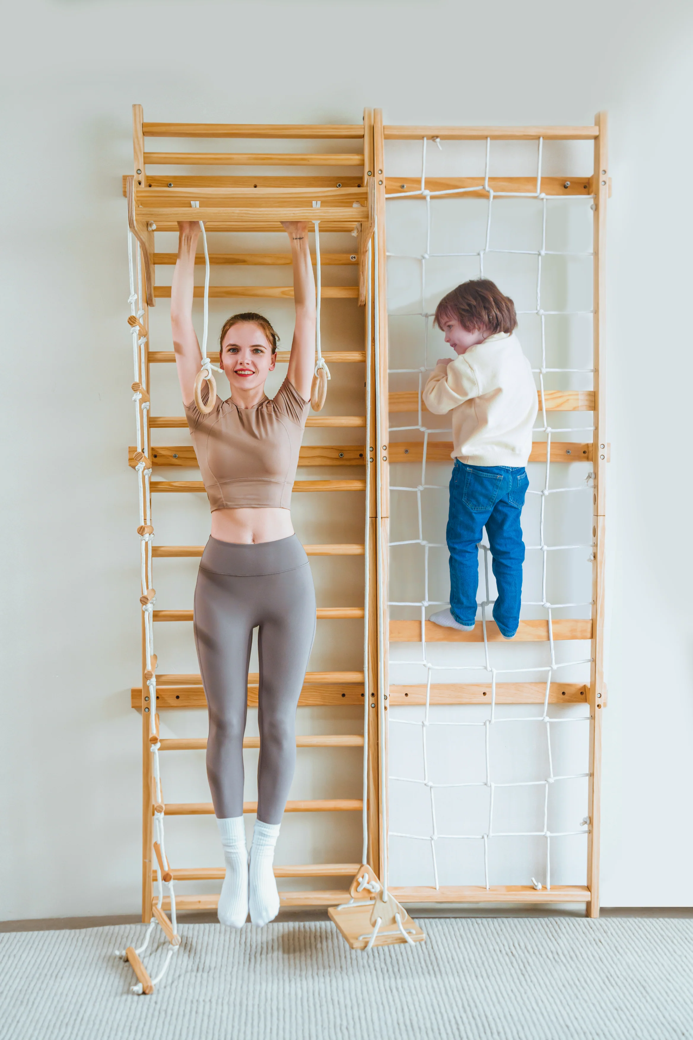 What's in store? A cargo wall climber for those adventurous spirits looking to scale new heights, a swing that brings joy with every breeze, a rope ladder that challenges climbers to reach higher, an adult pull-up bar for those seeking to strengthen their climbing muscles, and even a slide for a fun descent after the climb. It's the ultimate combination for play, exercise, and even tidying up your space with its sleek design.