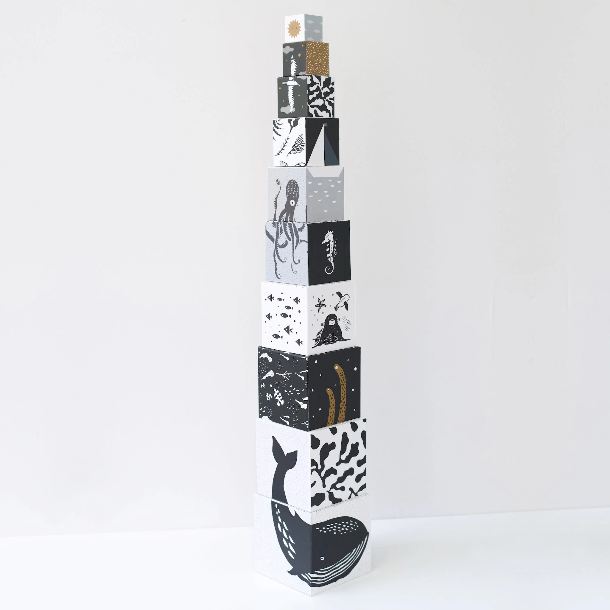 A toddler imagination can run wild with these whimsical ocean animals Nesting Blocks. Stack and play all day, explore numbers and counting all while enjoying the high-contrast patterns and illustrations.