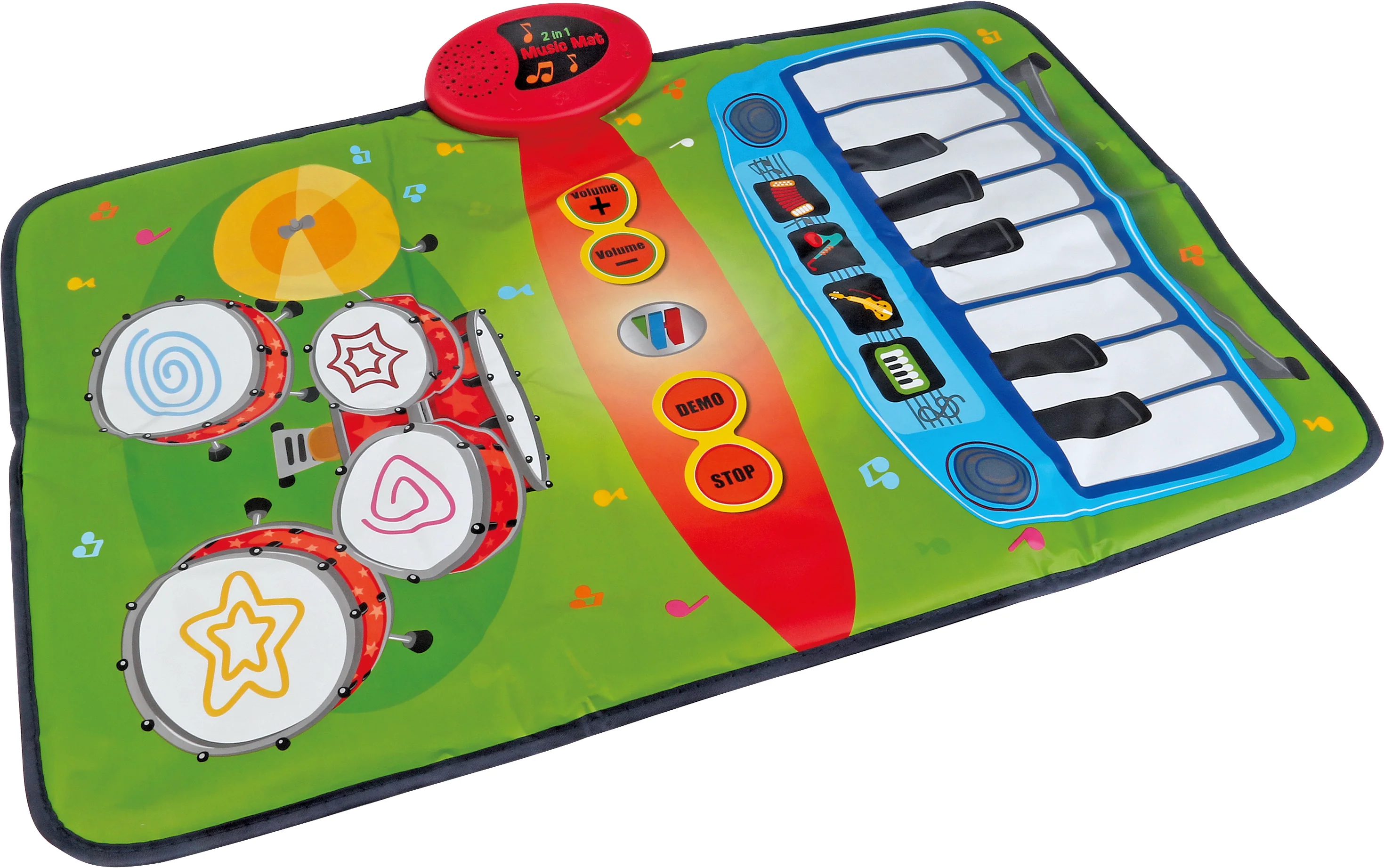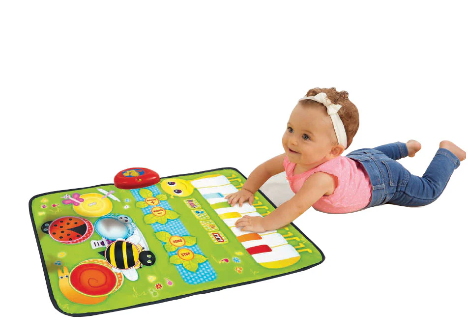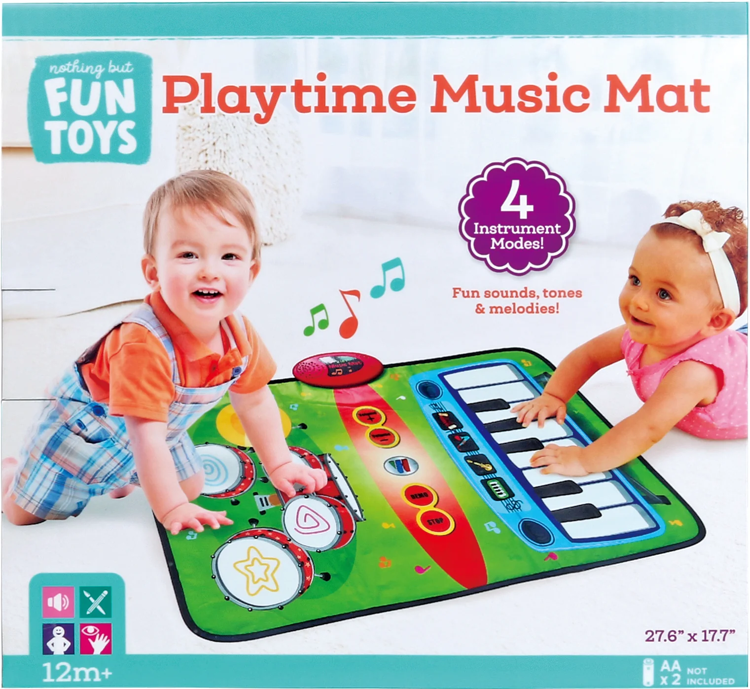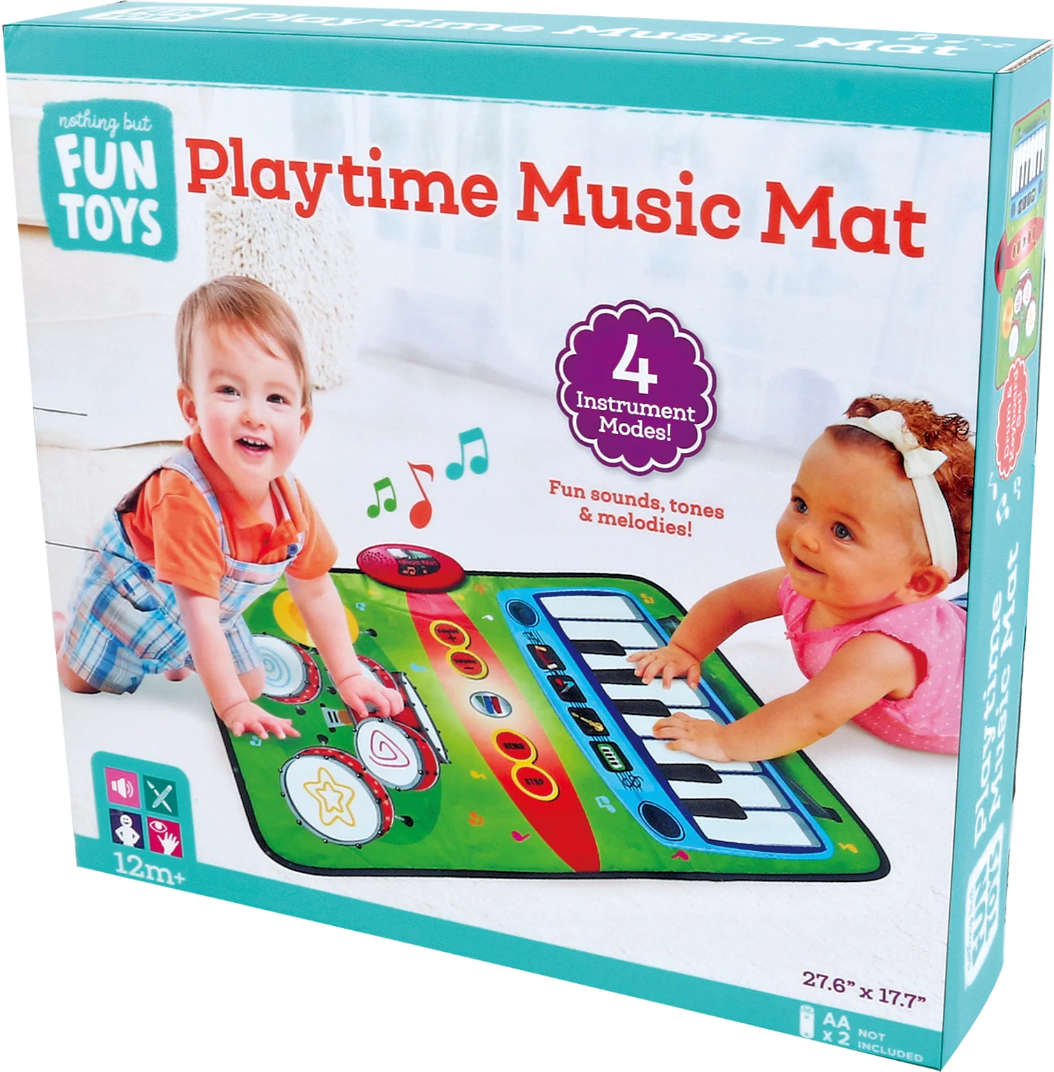 Kids who are fascinated by music will love playing with this Toddler Big Band Music Mat! The mat includes a big fun keyboard and a full drum set that lets them play all sorts of fun and exciting tunes. The Music Mat plays complete songs, in 4 different instruments, and has volume control. You can even fold it up and take it with you on the go! Requires 2 AA batteries, not included. Mat measures 27.6" L x 17.7" W.